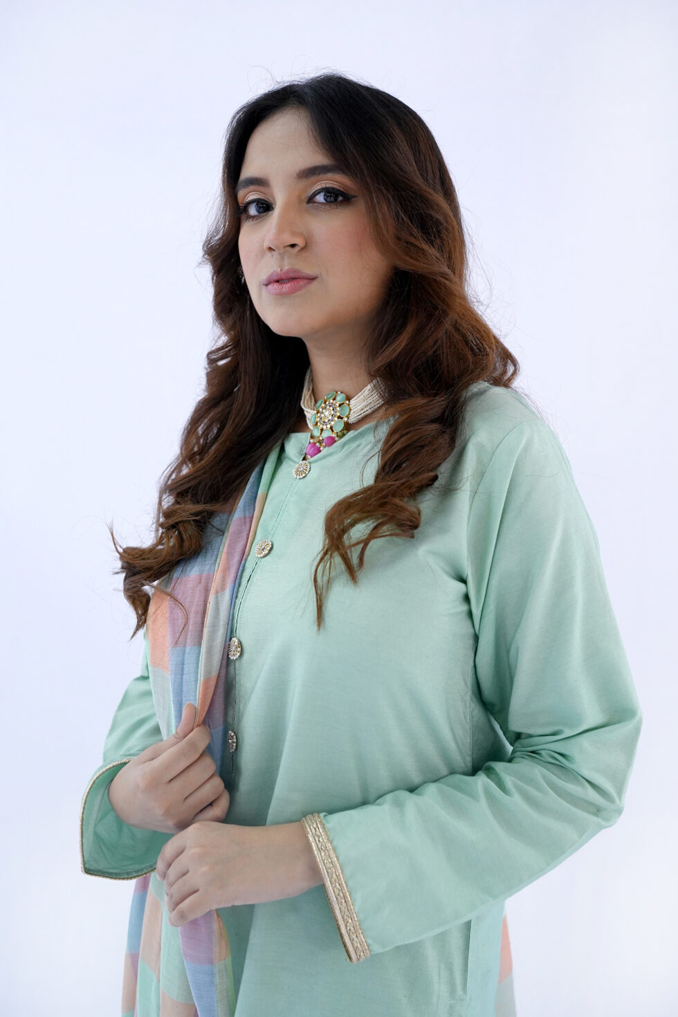 The sea green kameez adds a pop of color and personality to your outfit, making you stand out from the crowd. The intricate design is eye-catching and reflects your unique sense of style.