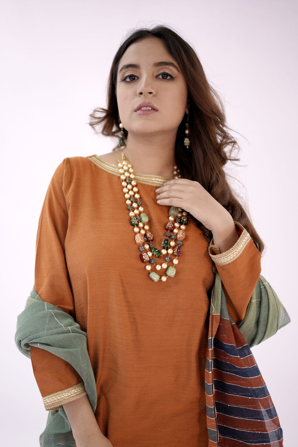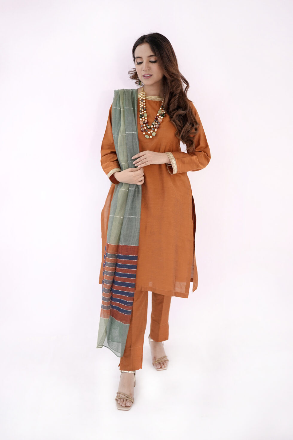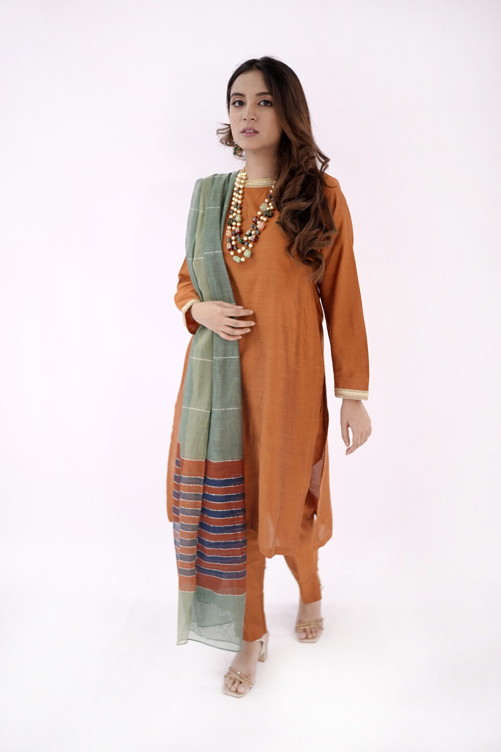 The three-piece set includes a graceful shirt, a matching pant, and a delicate dupatta crafted from sheer fabric, drapes elegantly over your shoulders, completing the look with a touch of grace.