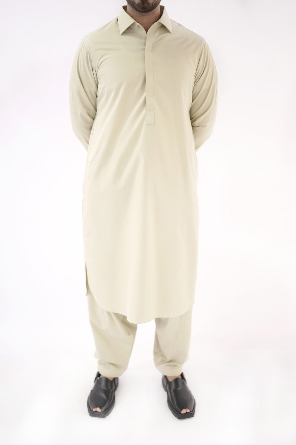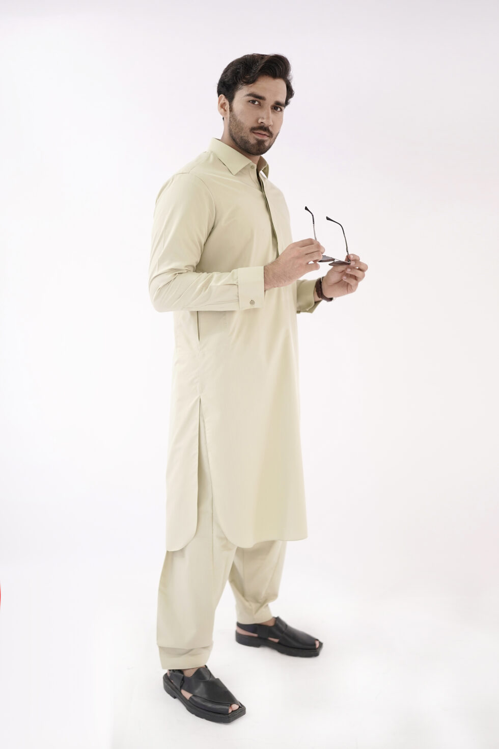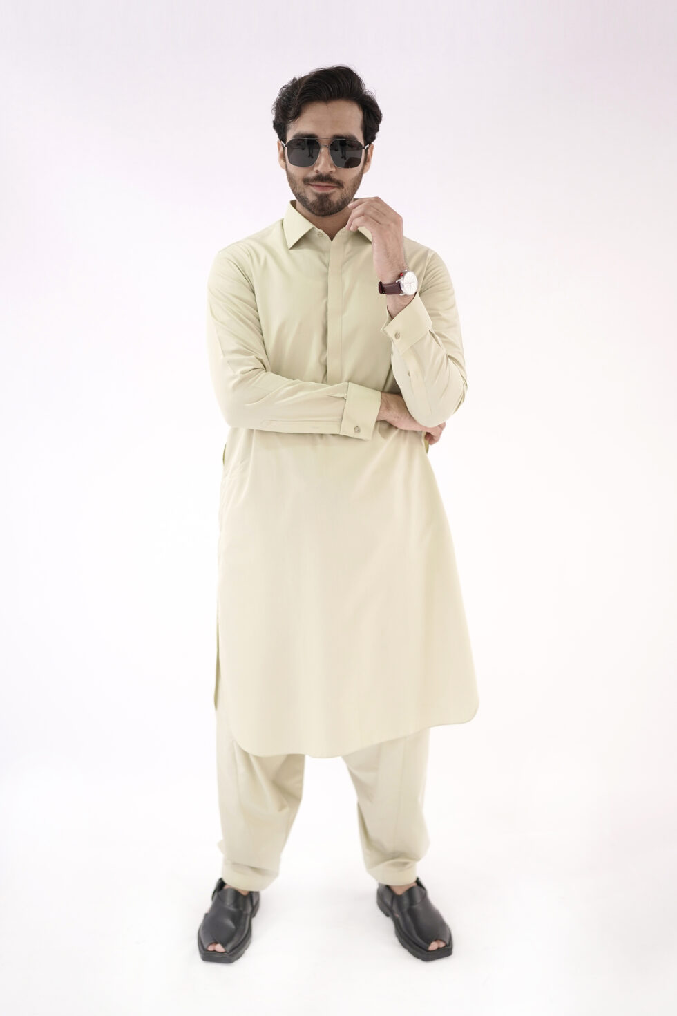 The Shine Green color exudes sophistication and versatility, making it easy to pair with different accessories and shoes. Whether you want to dress it up with a statement waistcoat or keep it simple with a classic pair of Peshawari chappal, this kurta shalwar effortlessly adapts to your personal style.
