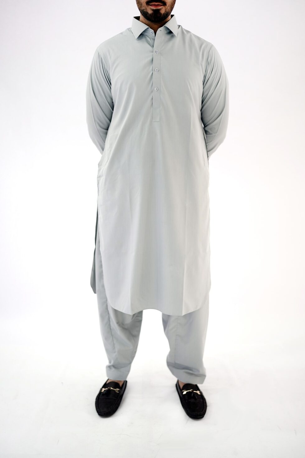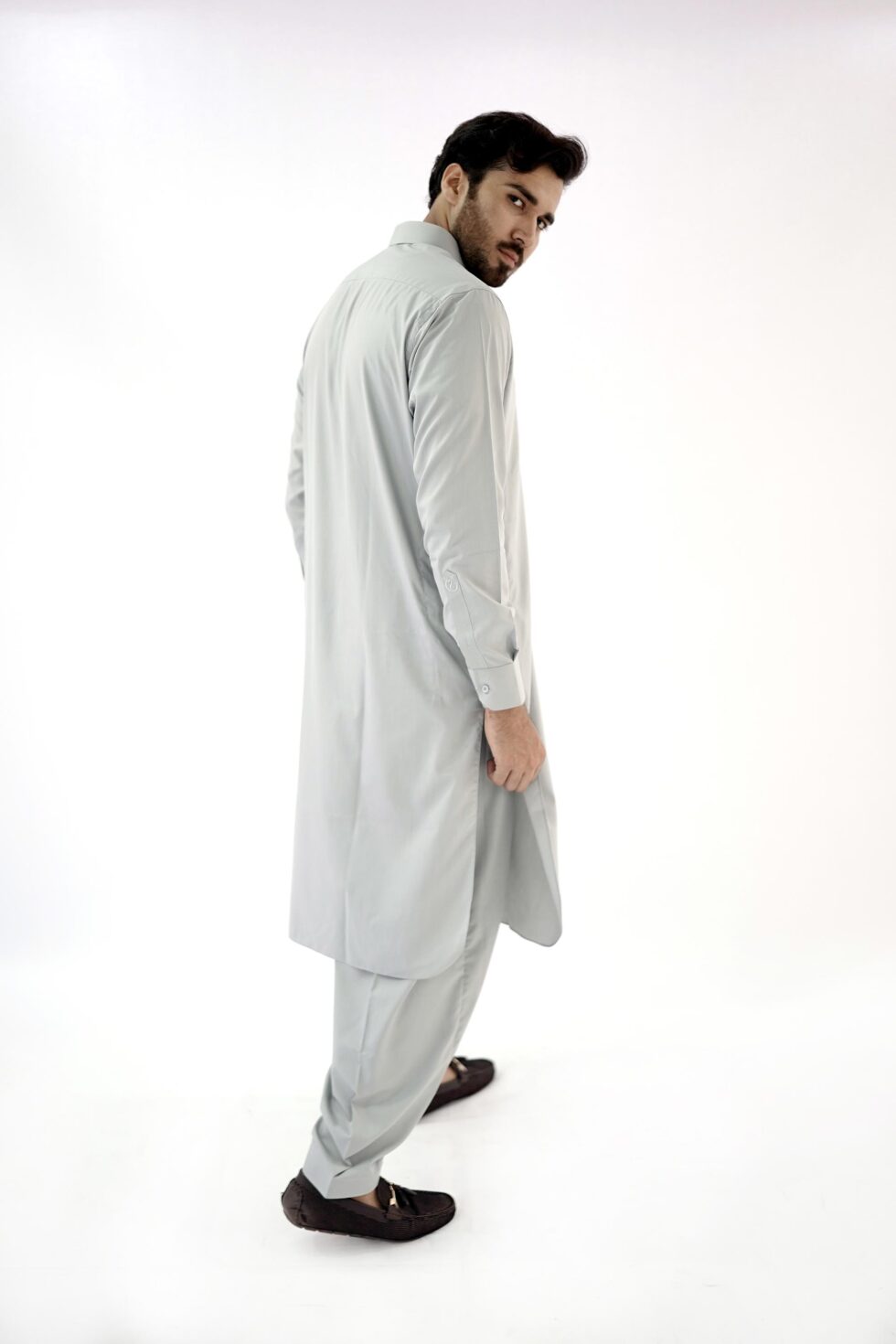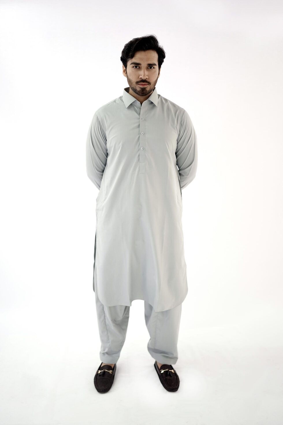 The Light Grey exudes sophistication and versatility, making it easy to pair with different accessories and shoes. Whether you want to dress it up with a statement waistcoat or keep it simple with a classic pair of mojari shoes, this mens kurta shalwar effortlessly adapts to your personal style.