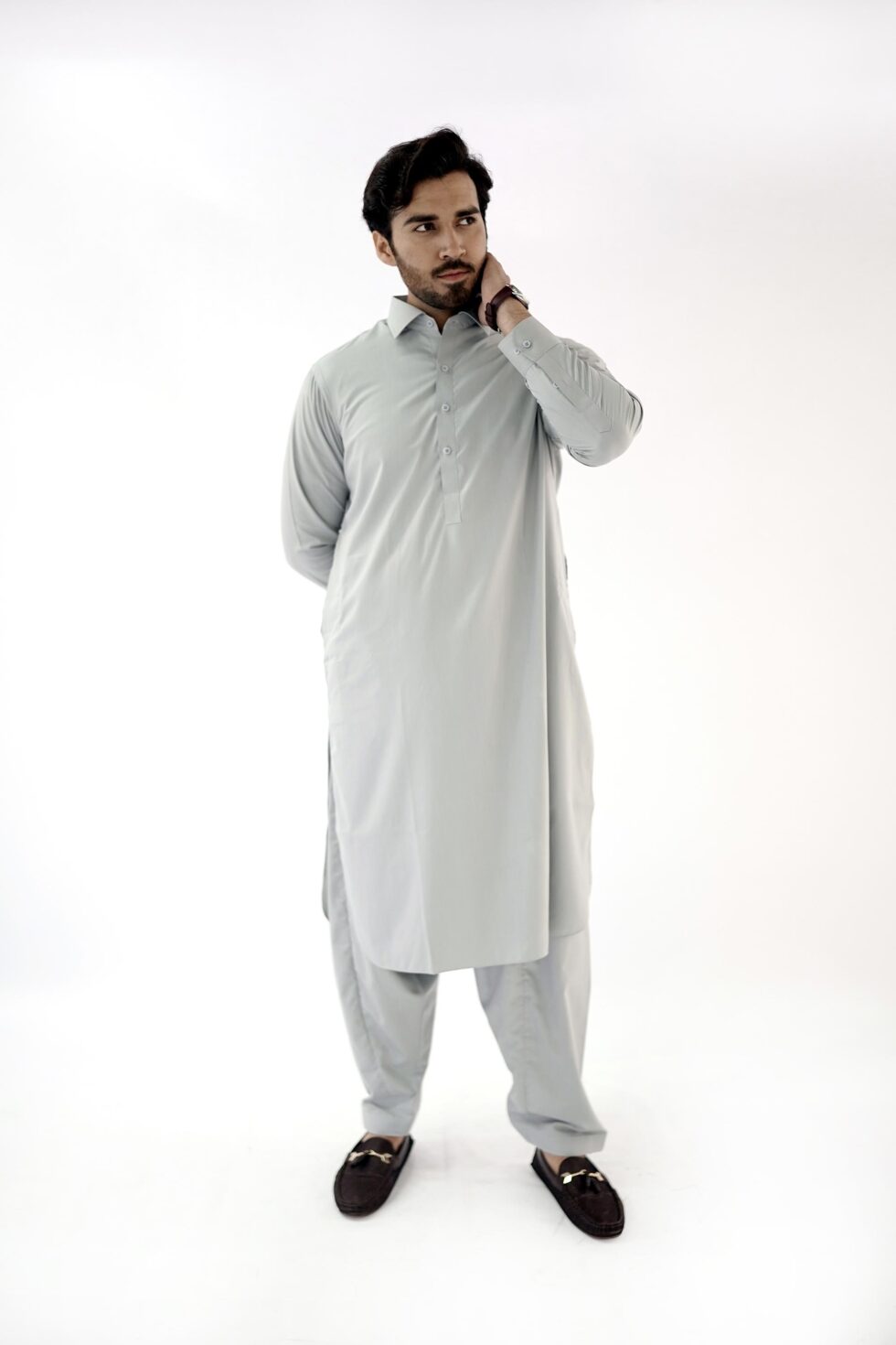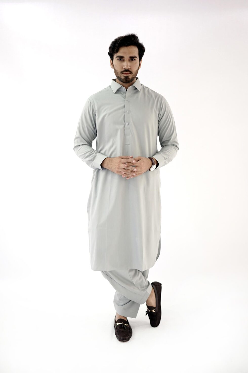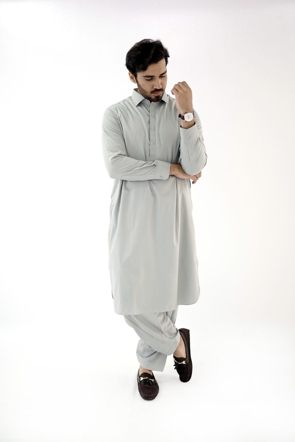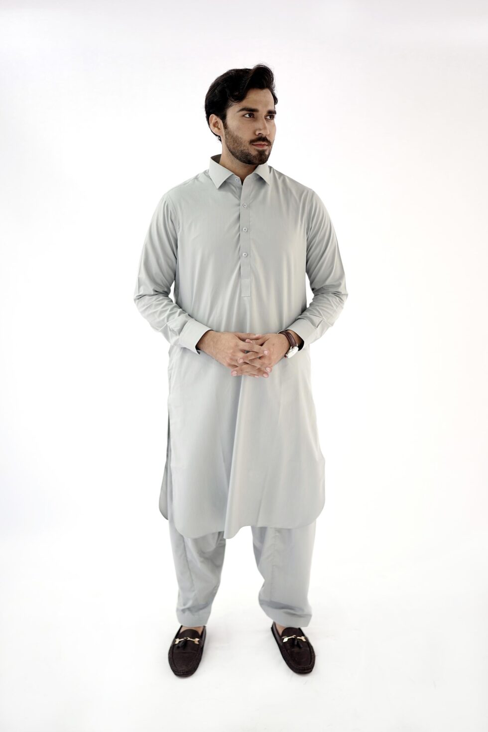 The Light Grey exudes sophistication and versatility, making it easy to pair with different accessories and shoes. Whether you want to dress it up with a statement waistcoat or keep it simple with a classic pair of mojari shoes, this mens kurta shalwar effortlessly adapts to your personal style.