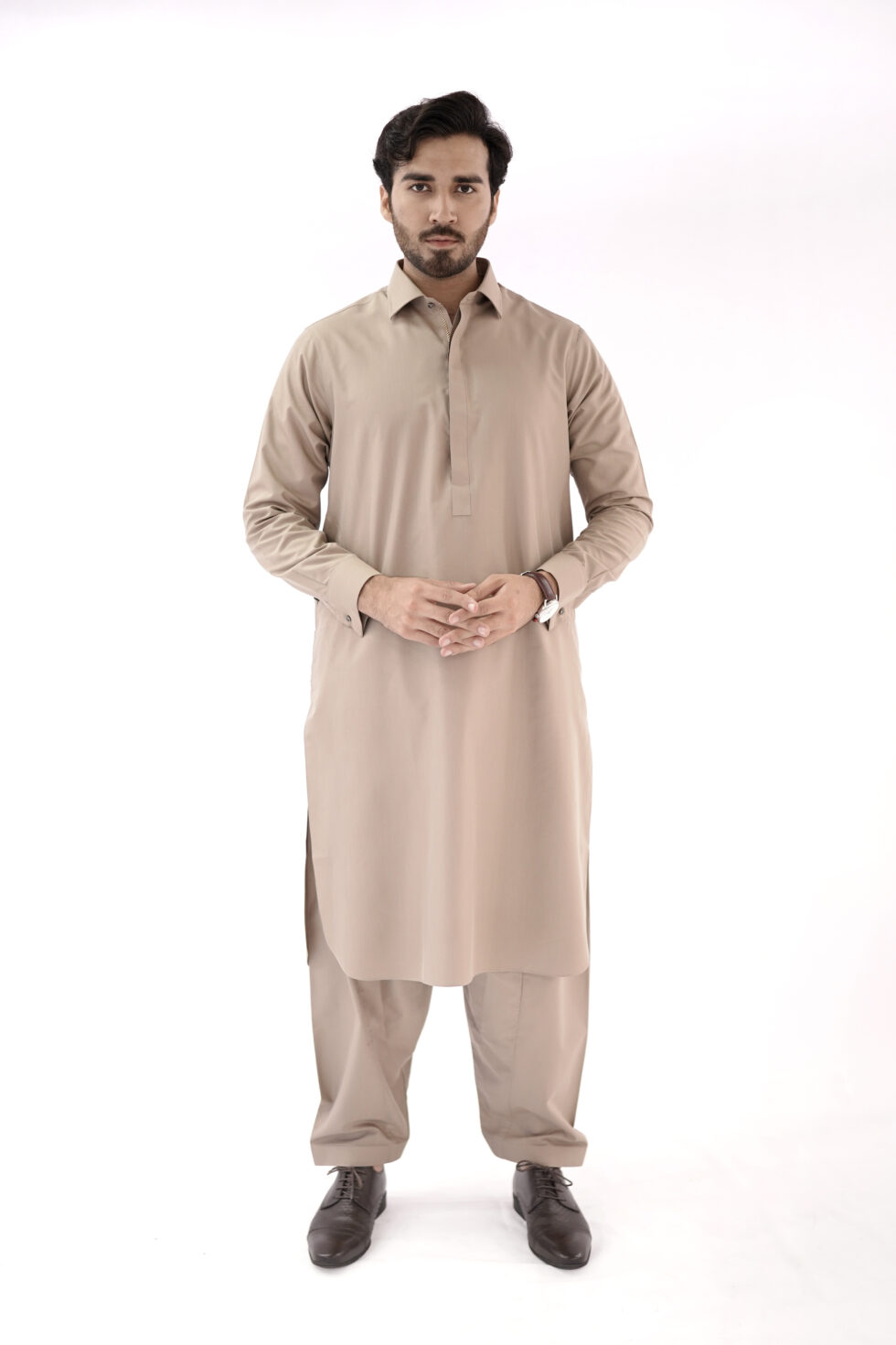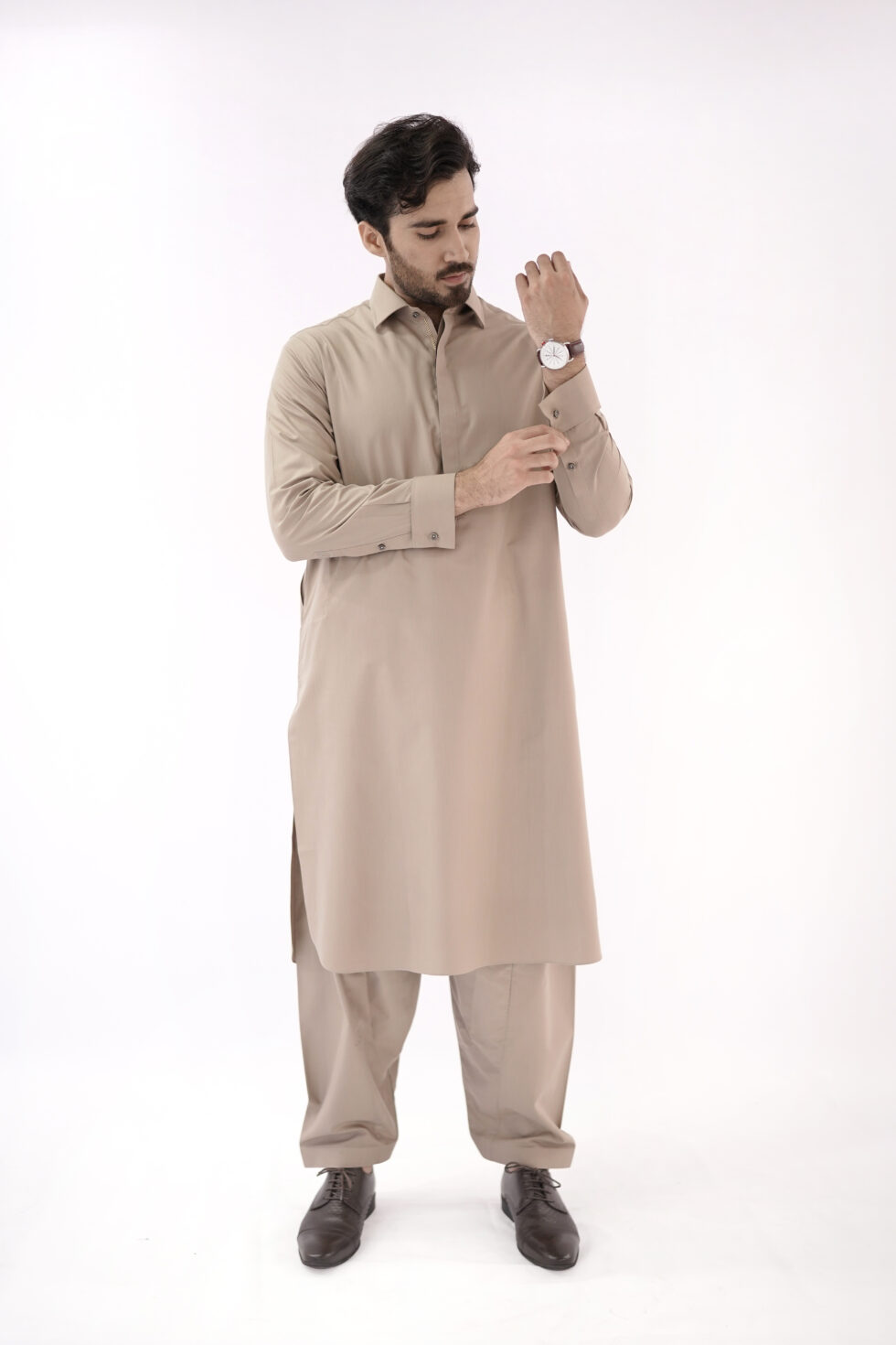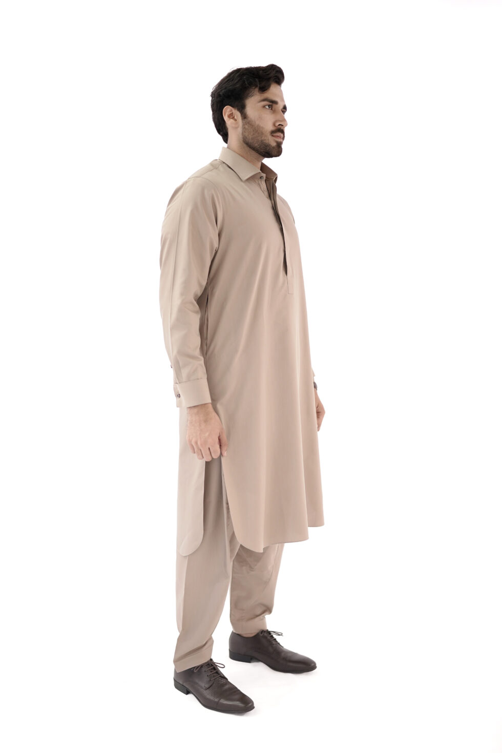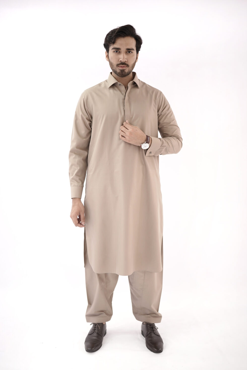 The Dark Coffee color exudes sophistication and versatility, making it easy to pair with different accessories and shoes. Whether you want to dress it up with a statement waistcoat or keep it simple with a classic pair of Peshawari chappal, this kurta shalwar effortlessly adapts to your personal style.