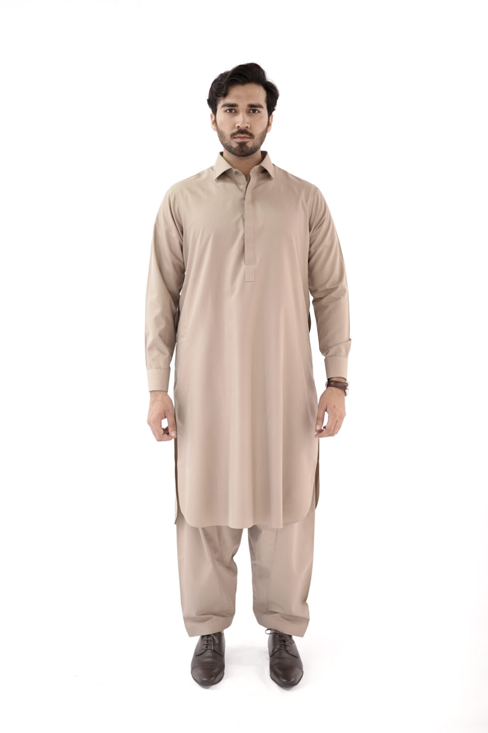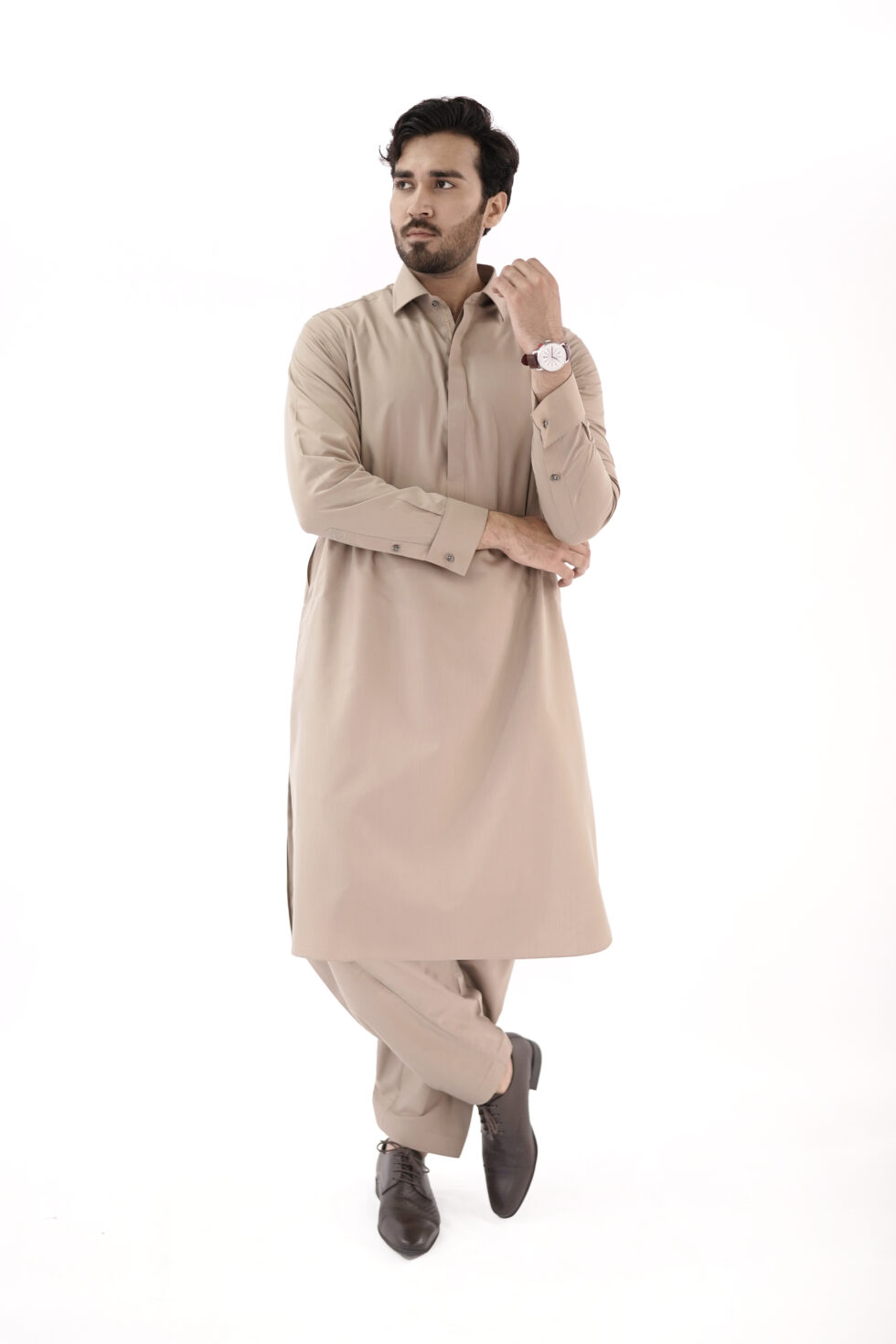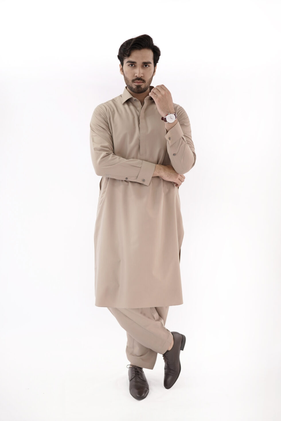 The Dark Coffee color exudes sophistication and versatility, making it easy to pair with different accessories and shoes. Whether you want to dress it up with a statement waistcoat or keep it simple with a classic pair of Peshawari chappal, this kurta shalwar effortlessly adapts to your personal style.