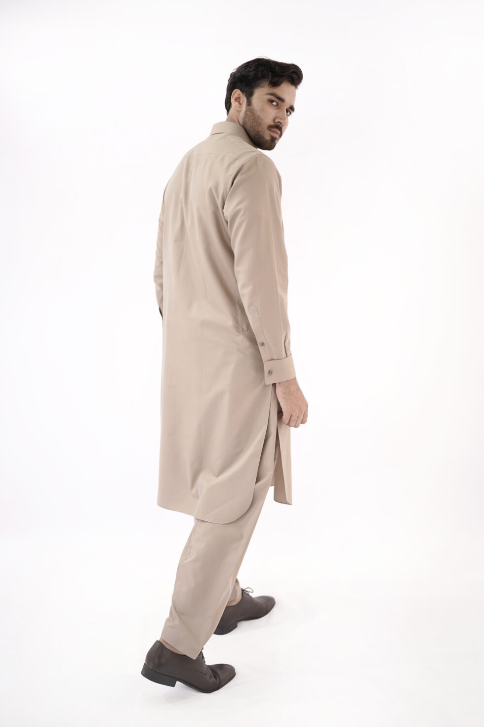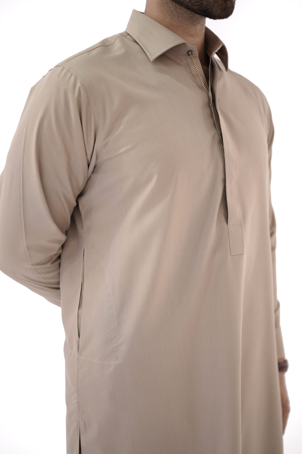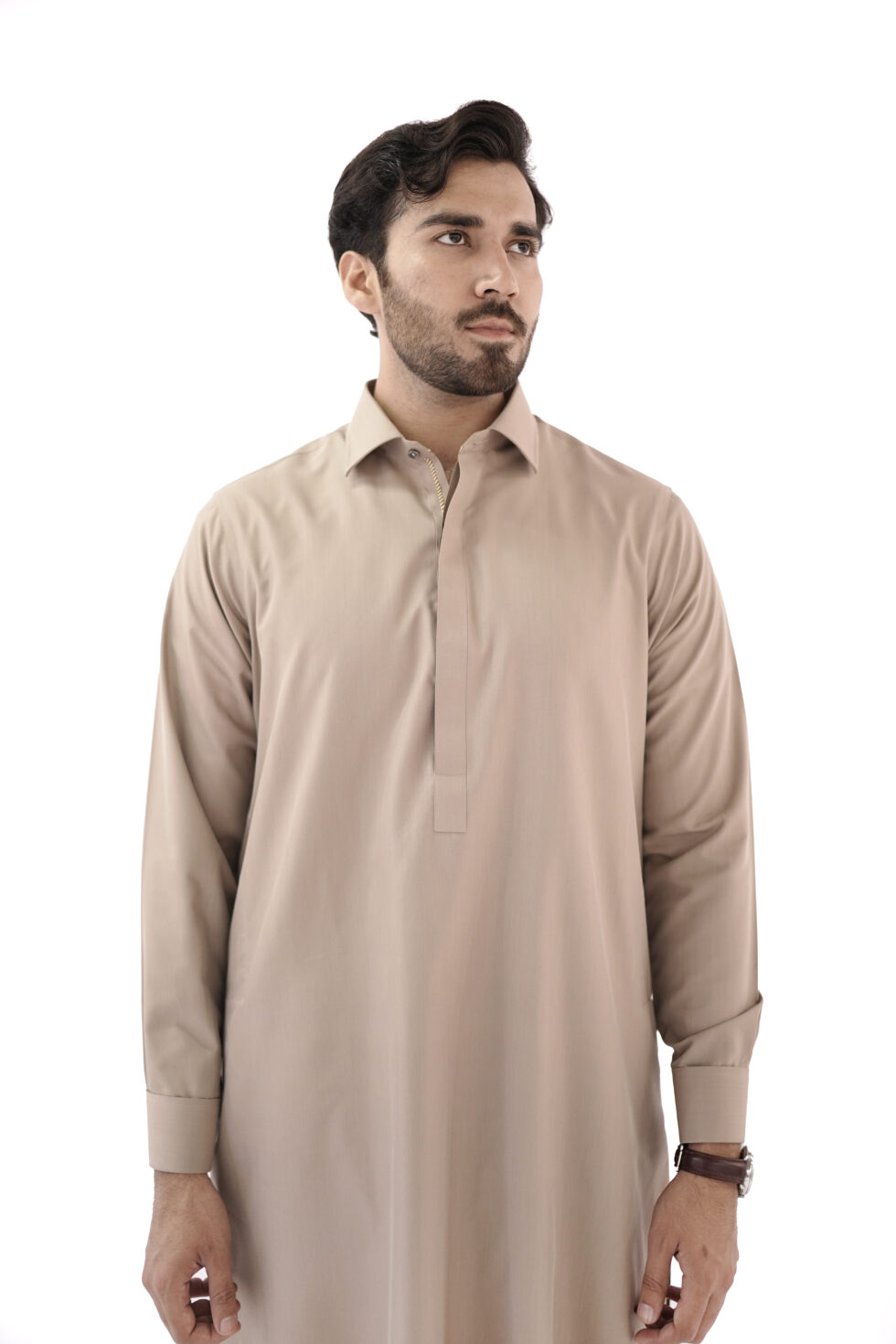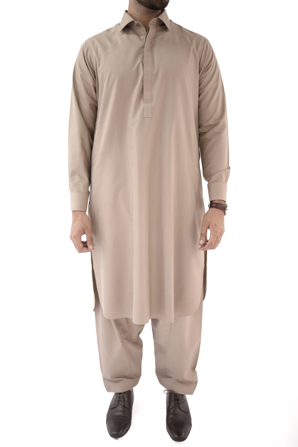The Dark Coffee color exudes sophistication and versatility, making it easy to pair with different accessories and shoes. Whether you want to dress it up with a statement waistcoat or keep it simple with a classic pair of Peshawari chappal, this kurta shalwar effortlessly adapts to your personal style.