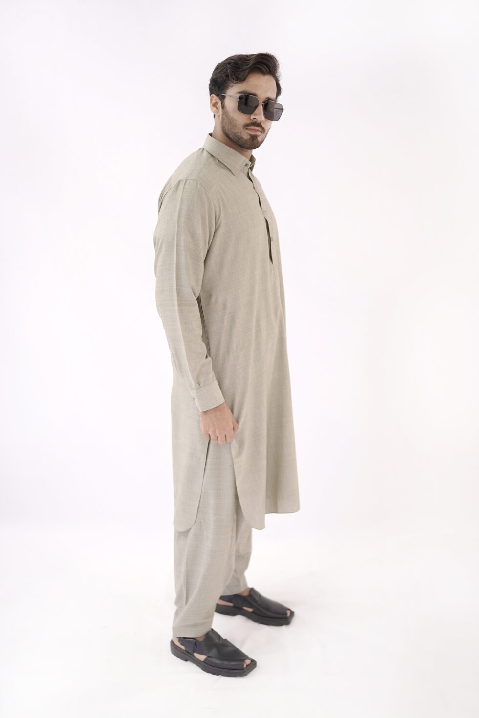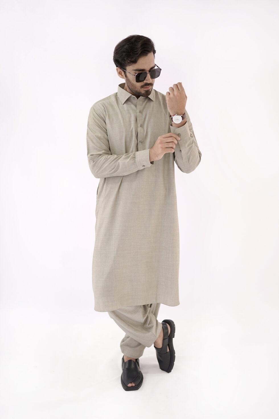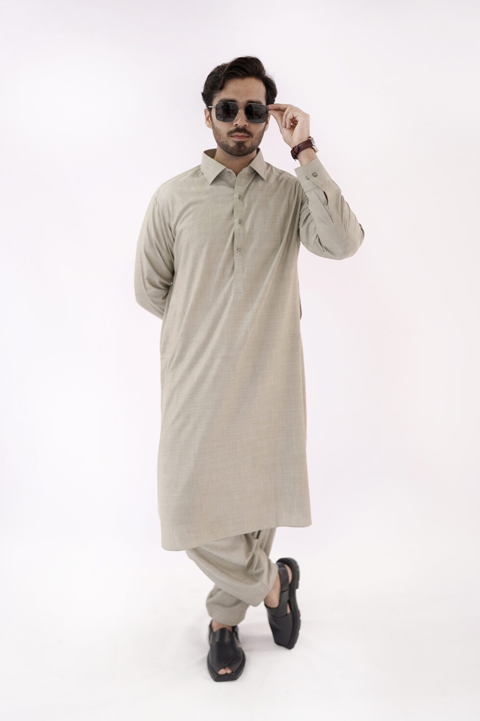 The Textured Light Grey color exudes sophistication and versatility, making it easy to pair with different accessories and shoes. Whether you want to dress it up with a statement waistcoat or keep it simple with a classic pair of Peshawari chappal, this kurta shalwar effortlessly adapts to your personal style.