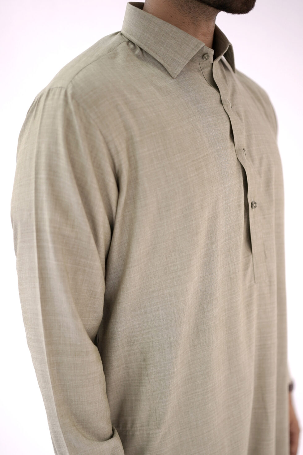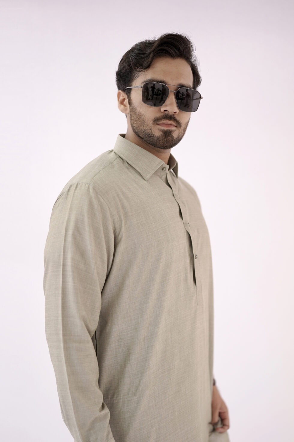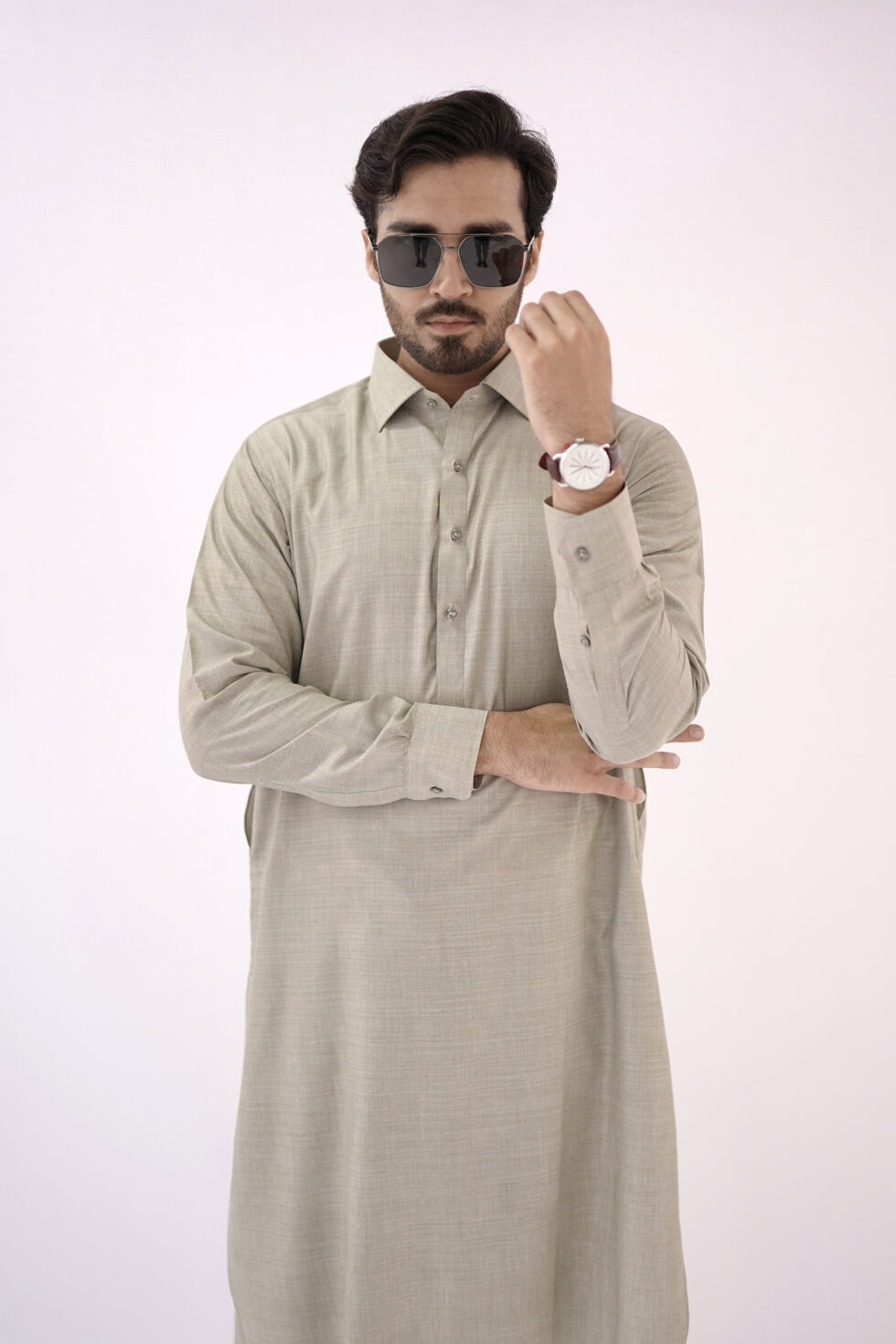 The Textured Light Grey color exudes sophistication and versatility, making it easy to pair with different accessories and shoes. Whether you want to dress it up with a statement waistcoat or keep it simple with a classic pair of Peshawari chappal, this kurta shalwar effortlessly adapts to your personal style.