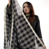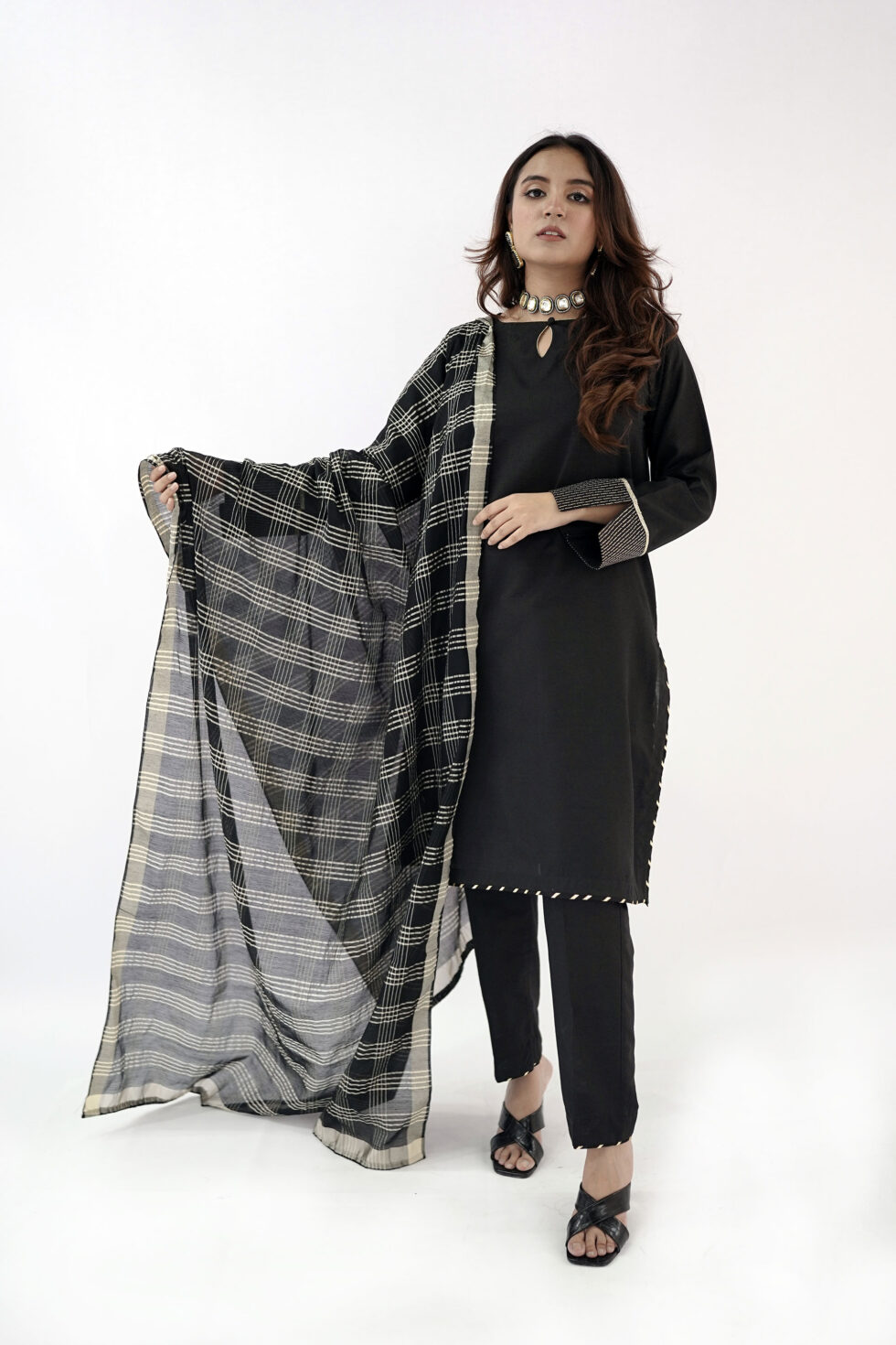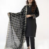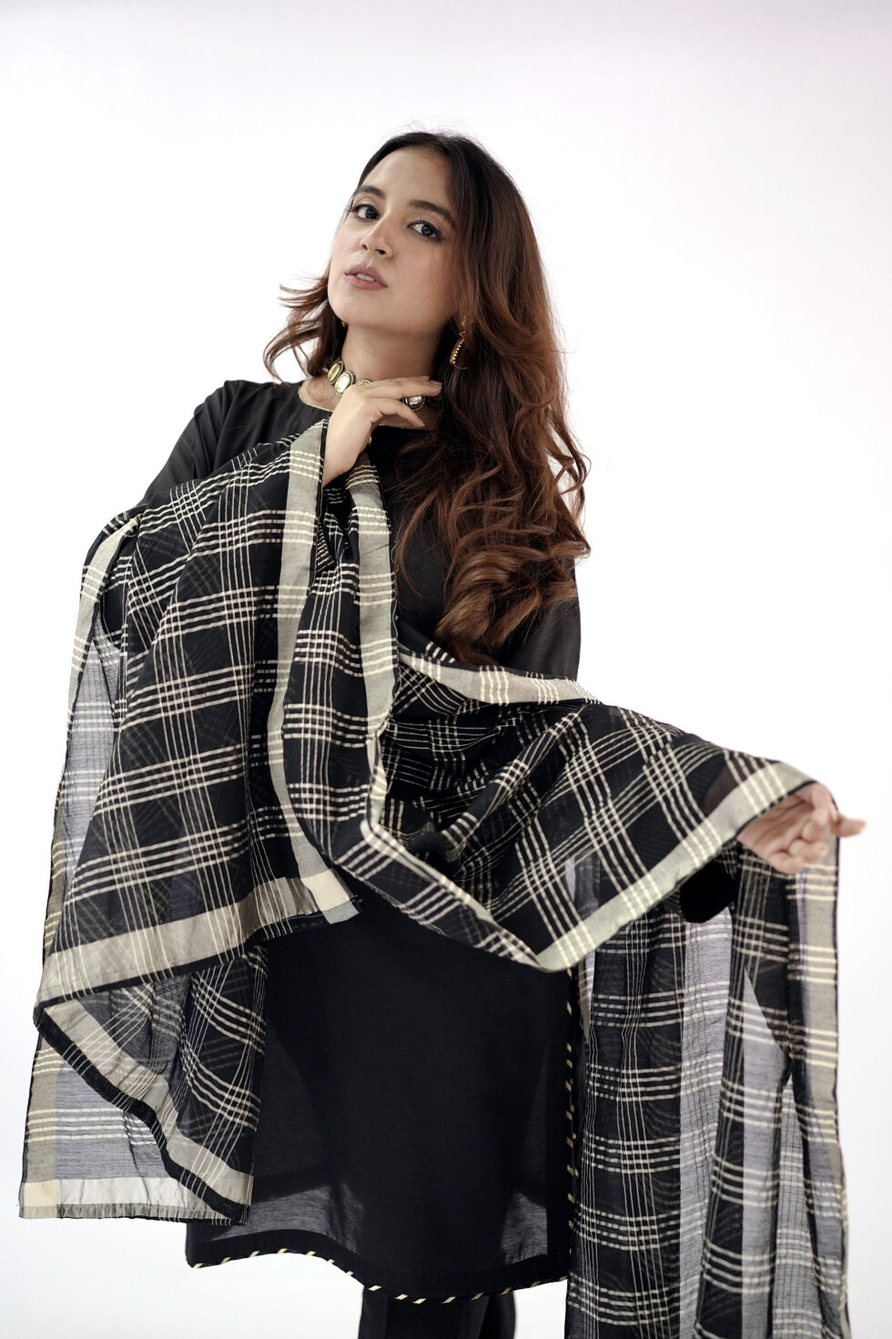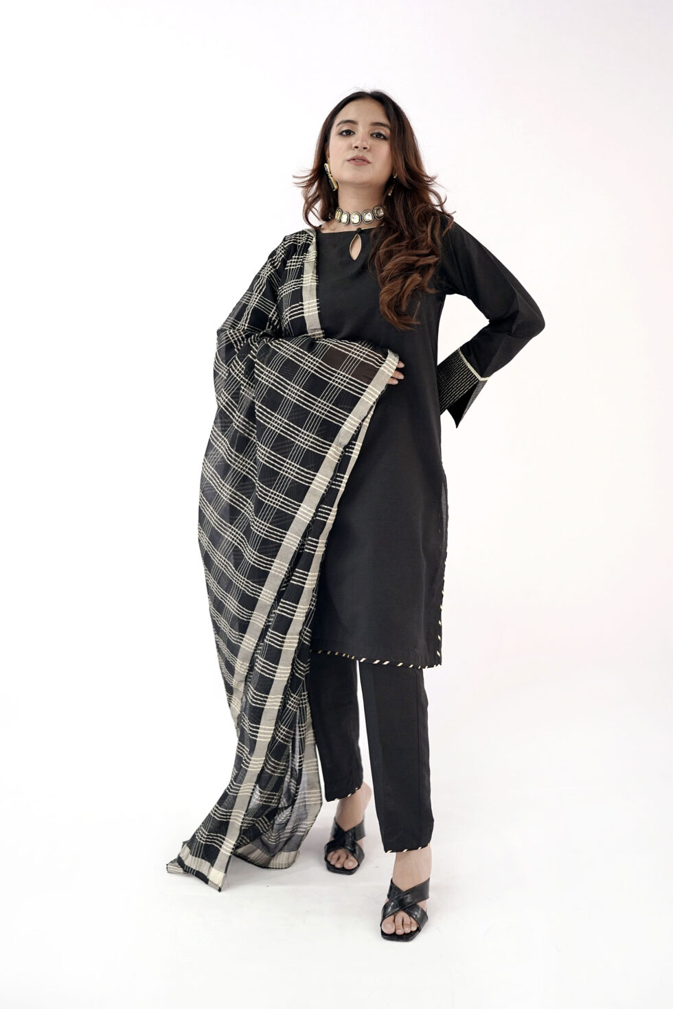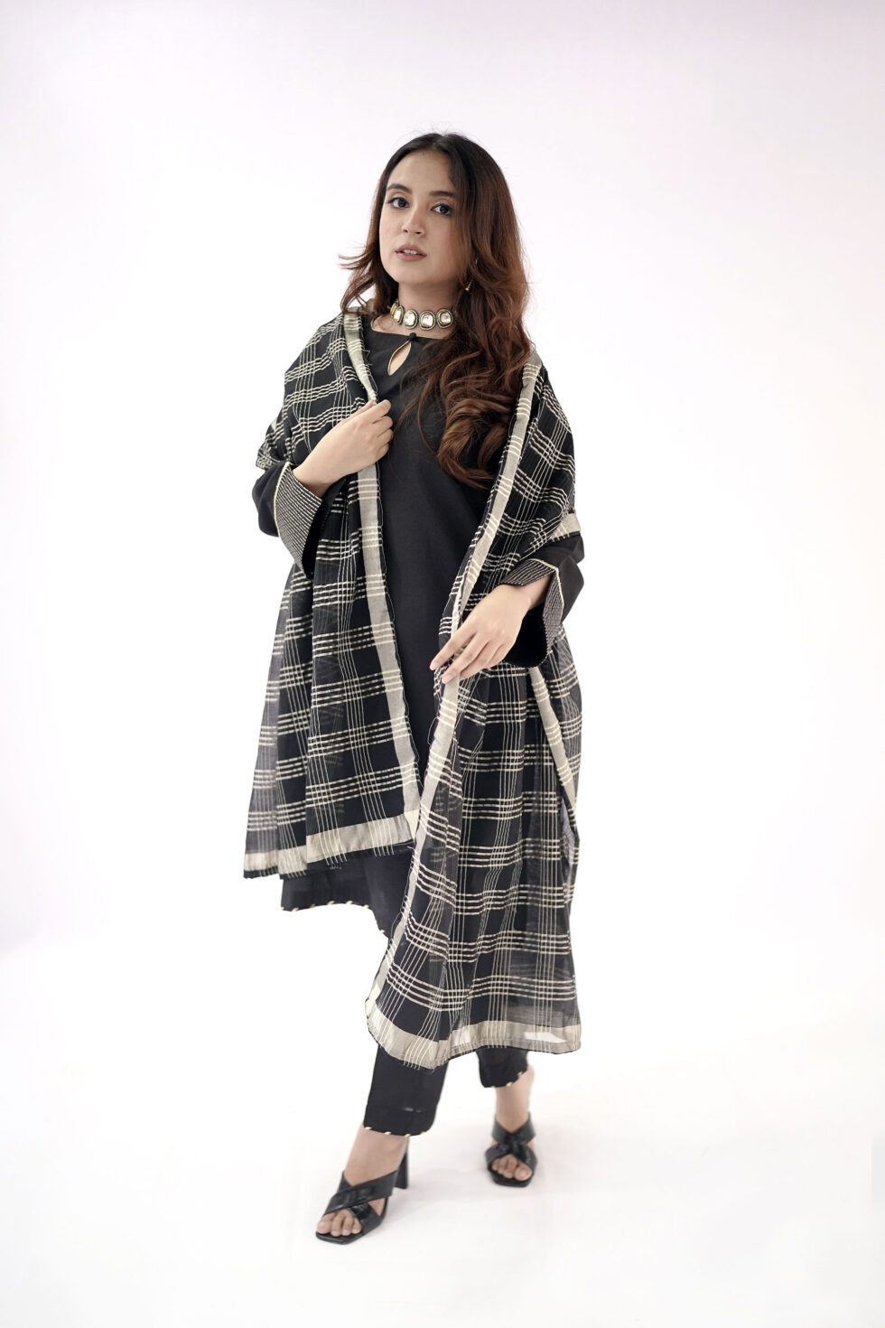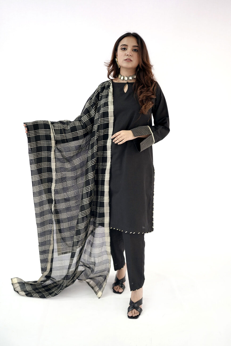 The three-piece set includes a graceful shirt, a matching trouser, and a delicate checked dupatta crafted from sheer fabric, drapes elegantly over your shoulders, completing the look with a touch of grace.