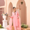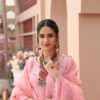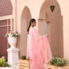 Discover latest party wear dresses – Diamond Cut (3 Pcs). Boat neckline, pleated front straight shirt, with an embellished cutwork neckline further enhanced with refined embroidery, sparkling zardozi, sequins, stones and dabka. Sequins. Paired with pink straight pants and topped with a pink embroidered organza dupatta with lace finishing.