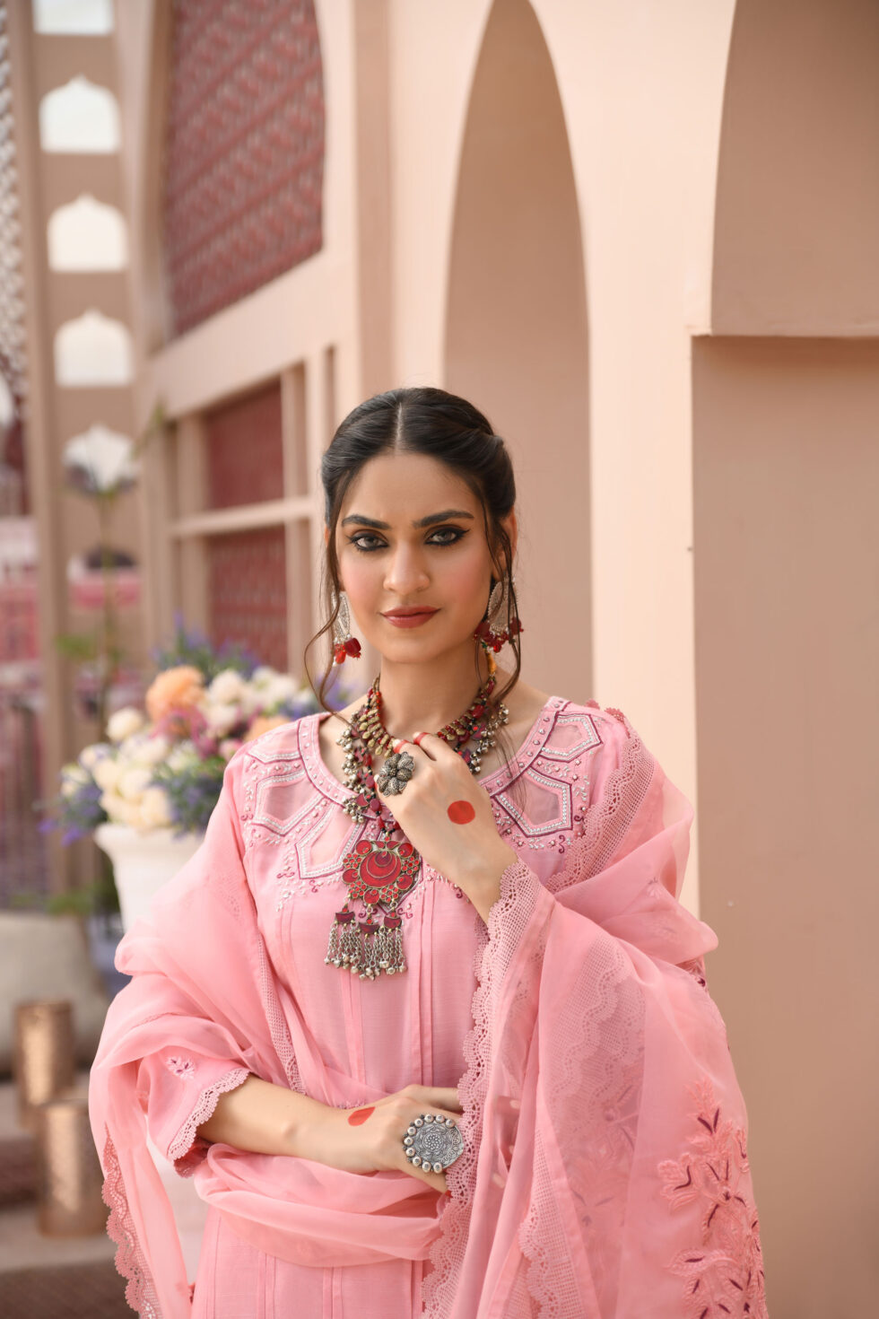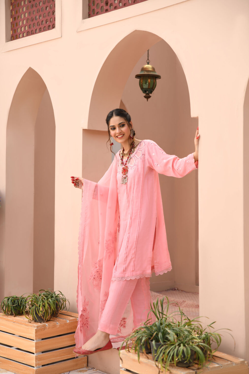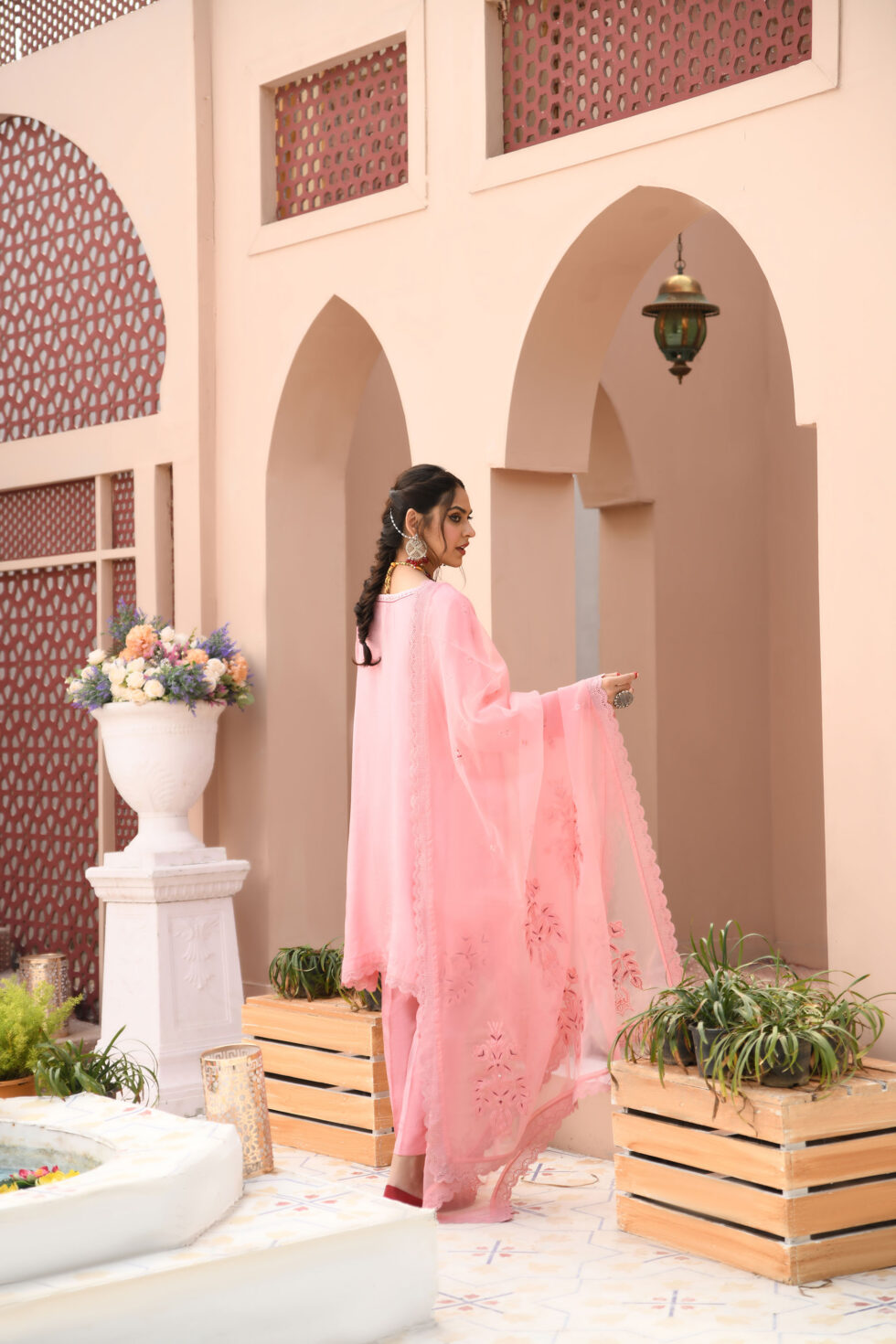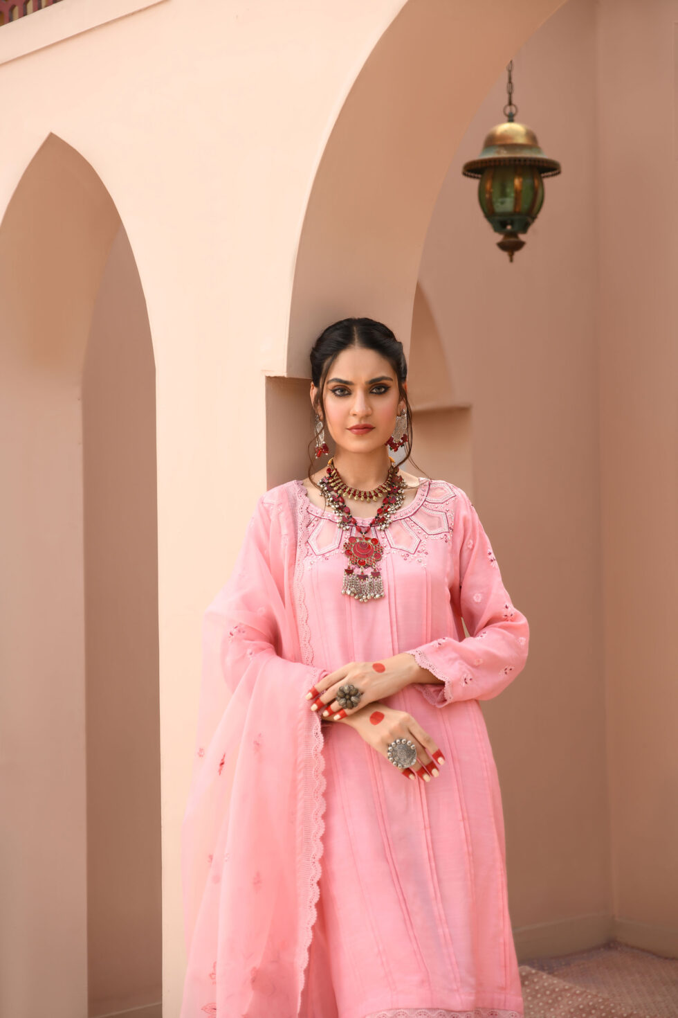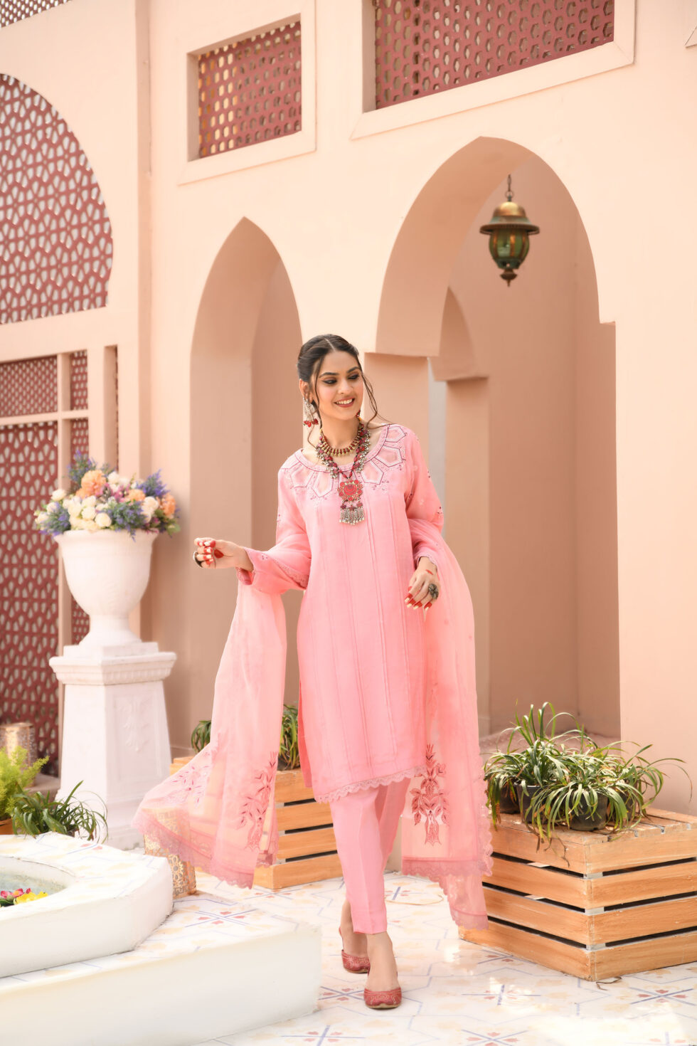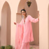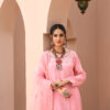 Boat neckline, pleated front straight shirt, with an embellished cutwork neckline further enhanced with refined embroidery, sparkling zardozi, sequins, stones and dabka. Sequins. Paired with pink straight pants and topped with a pink embroidered organza dupatta with lace finishing.