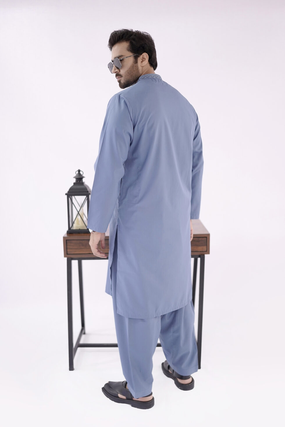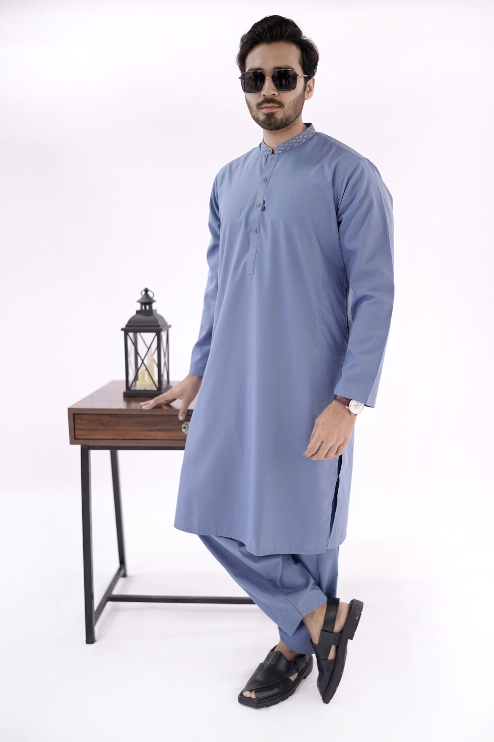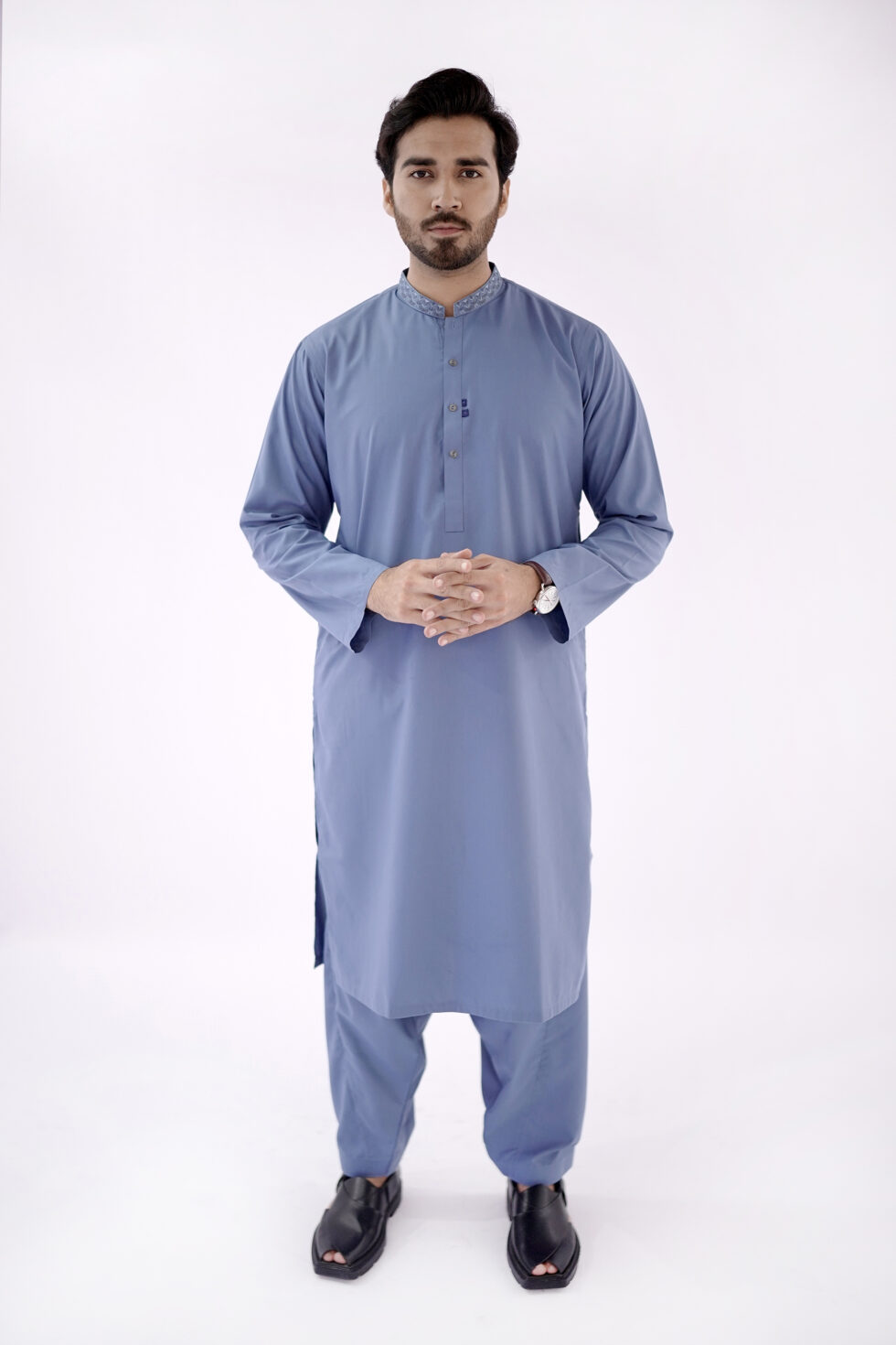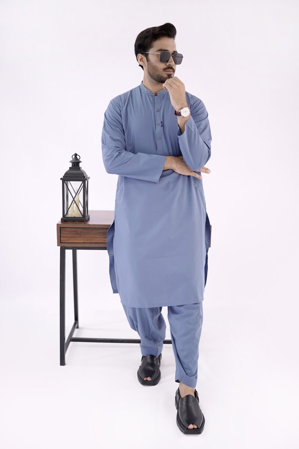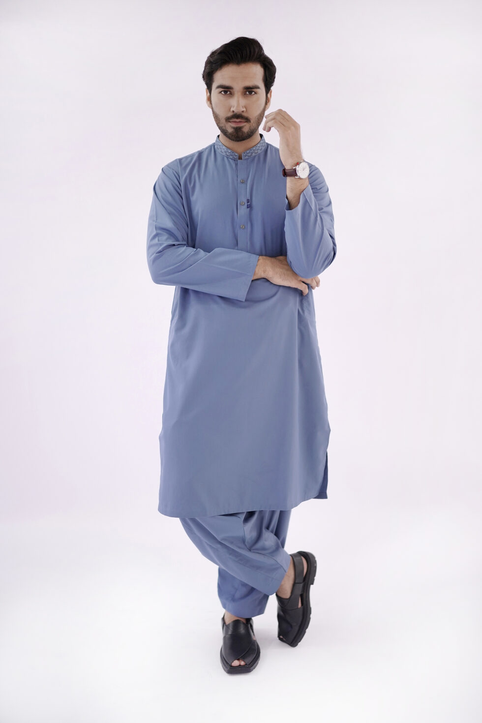 The embroidered blue exudes sophistication and versatility, making it easy to pair with different accessories and shoes. Whether you want to dress it up with a statement waistcoat or keep it simple with a classic pair of mojari shoes, this mens kurta shalwar effortlessly adapts to your personal style.