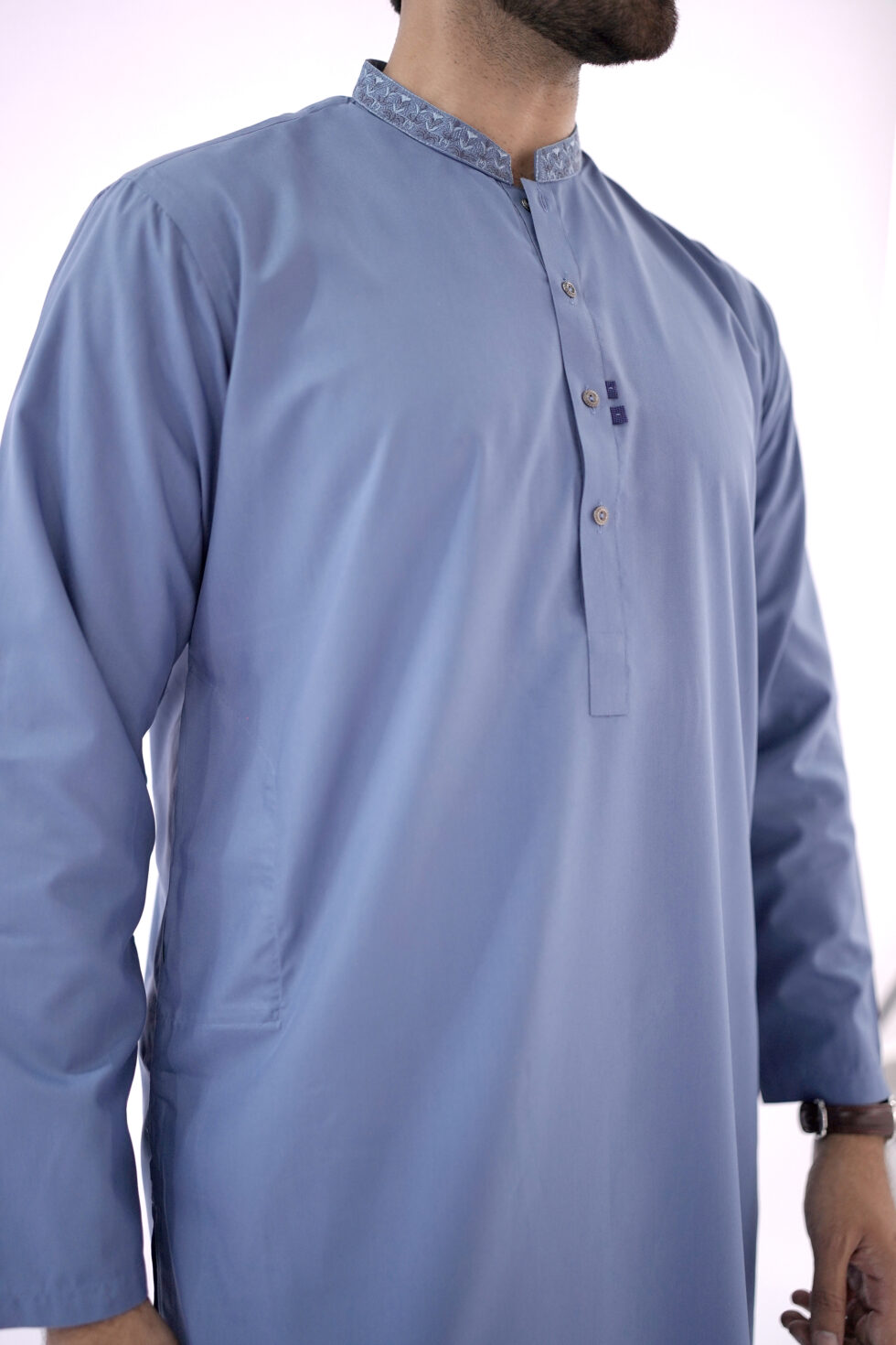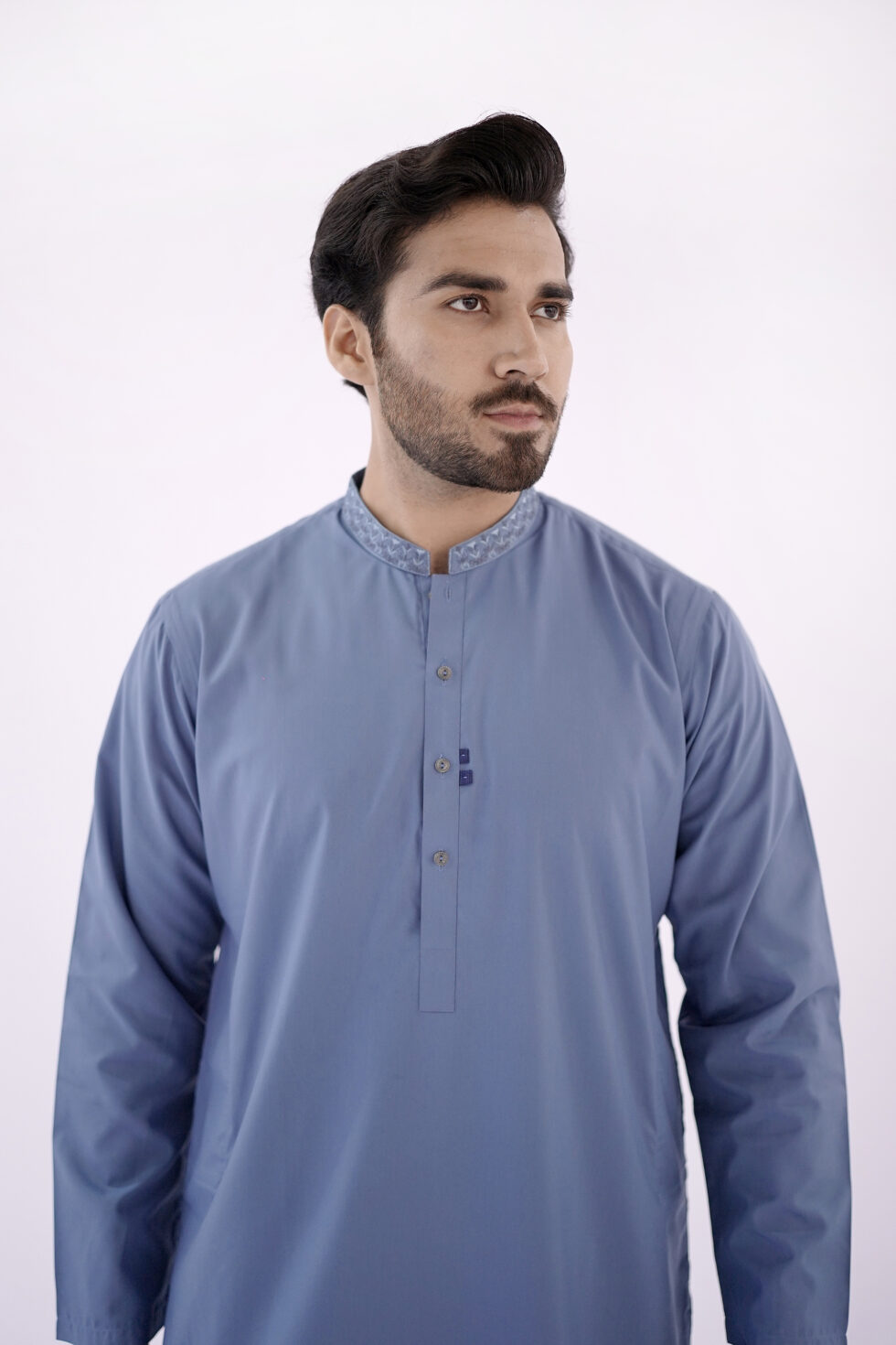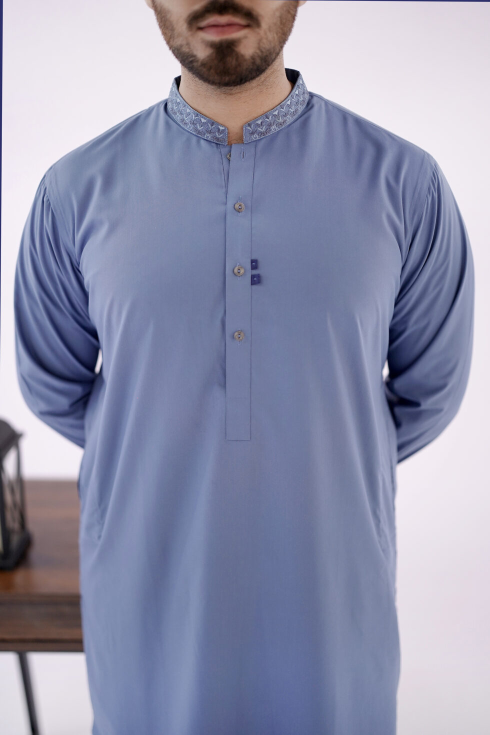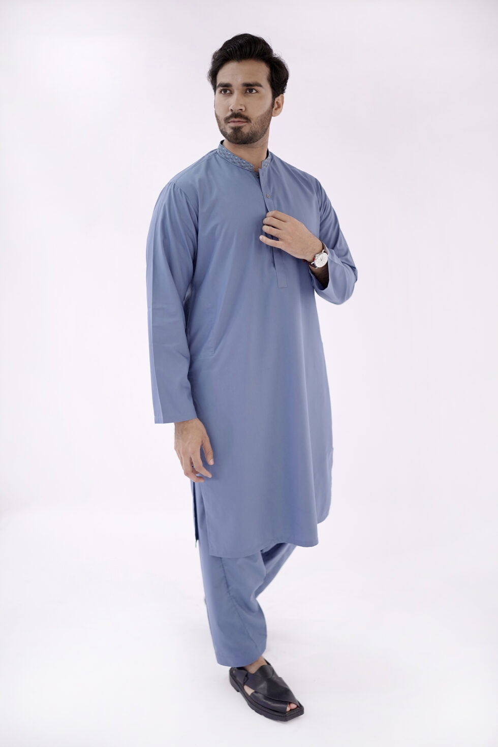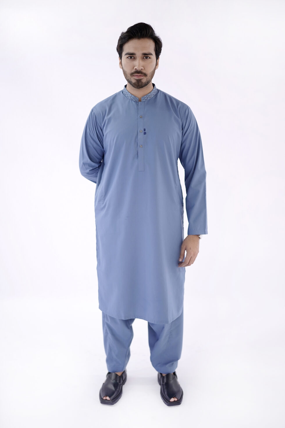 The embroidered blue exudes sophistication and versatility, making it easy to pair with different accessories and shoes. Whether you want to dress it up with a statement waistcoat or keep it simple with a classic pair of mojari shoes, this mens kurta shalwar effortlessly adapts to your personal style.