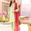 The three-piece set includes a graceful shirt, a matching pant, and a delicate Hot pink khaadi net dupatta crafted from sheer fabric, drapes elegantly over your shoulders, completing the look with a touch of grace.