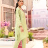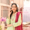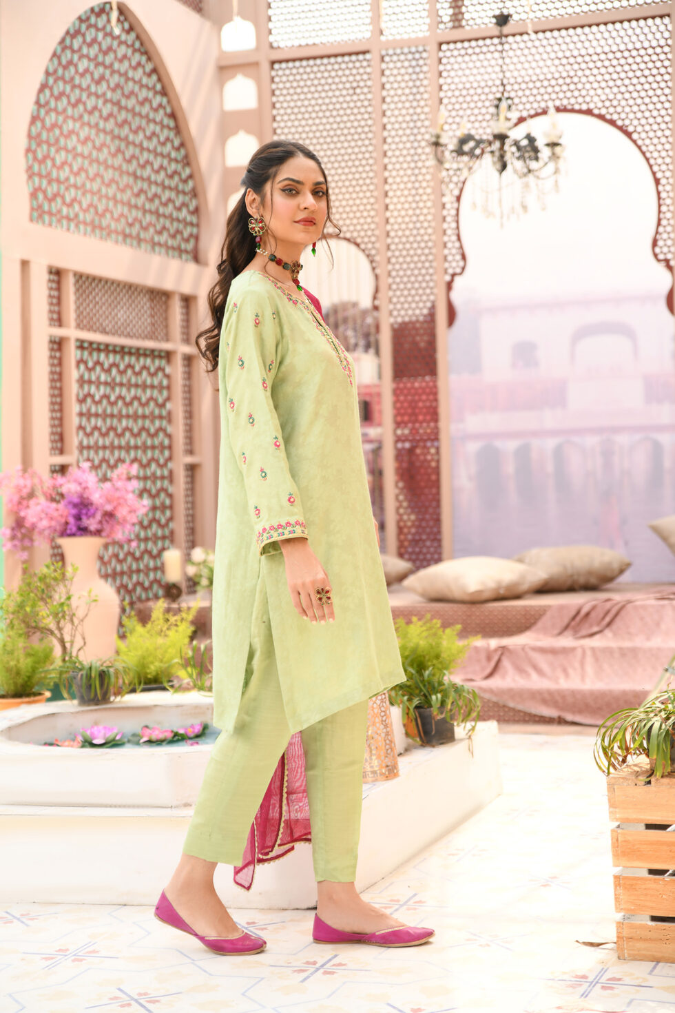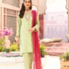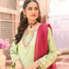 Discover our stylish party wearing dress – Afsaana (3 Pcs). Round neckline with pleats, straight shirt, with an embellished cut work neckline further enhanced with refined embroidery, sparkling Zardozi, sequins, Stones and Dabka. Paired with Pista green straight pants and topped with a Hot pink khaadi net dupatta with lace finishing and tassels.