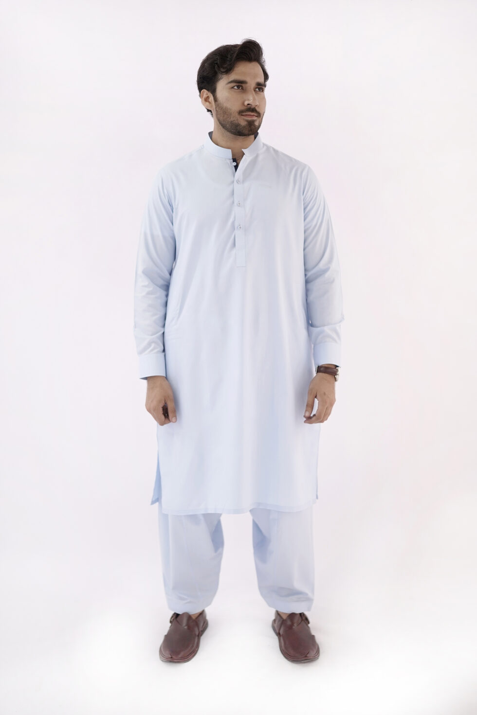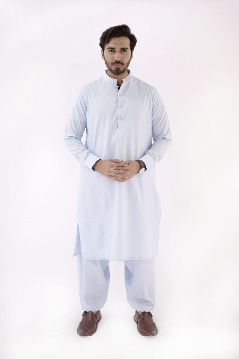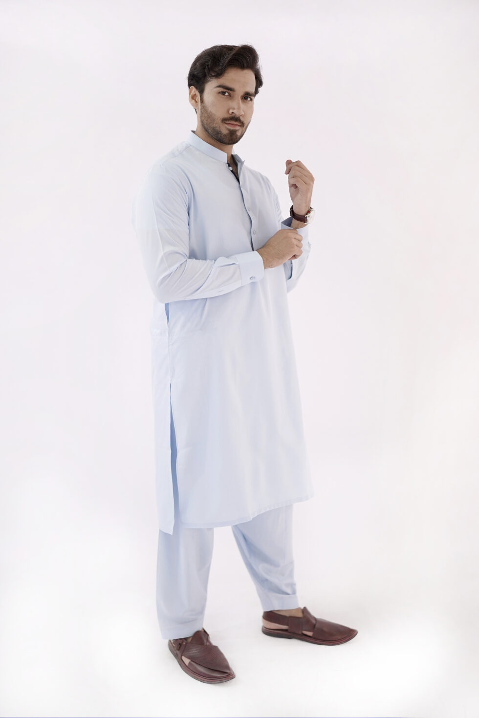Introducing the men shalwar kurta in a sky light color, designed to embrace both comfort and style. This slim-fit ensemble is perfect for any occasion, whether it’s a festive celebration or a casual outing.