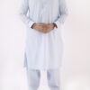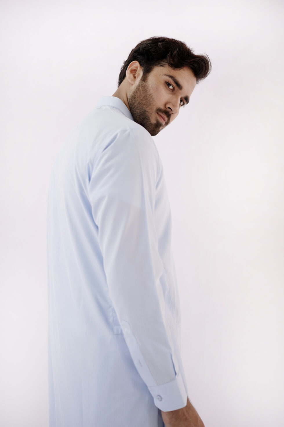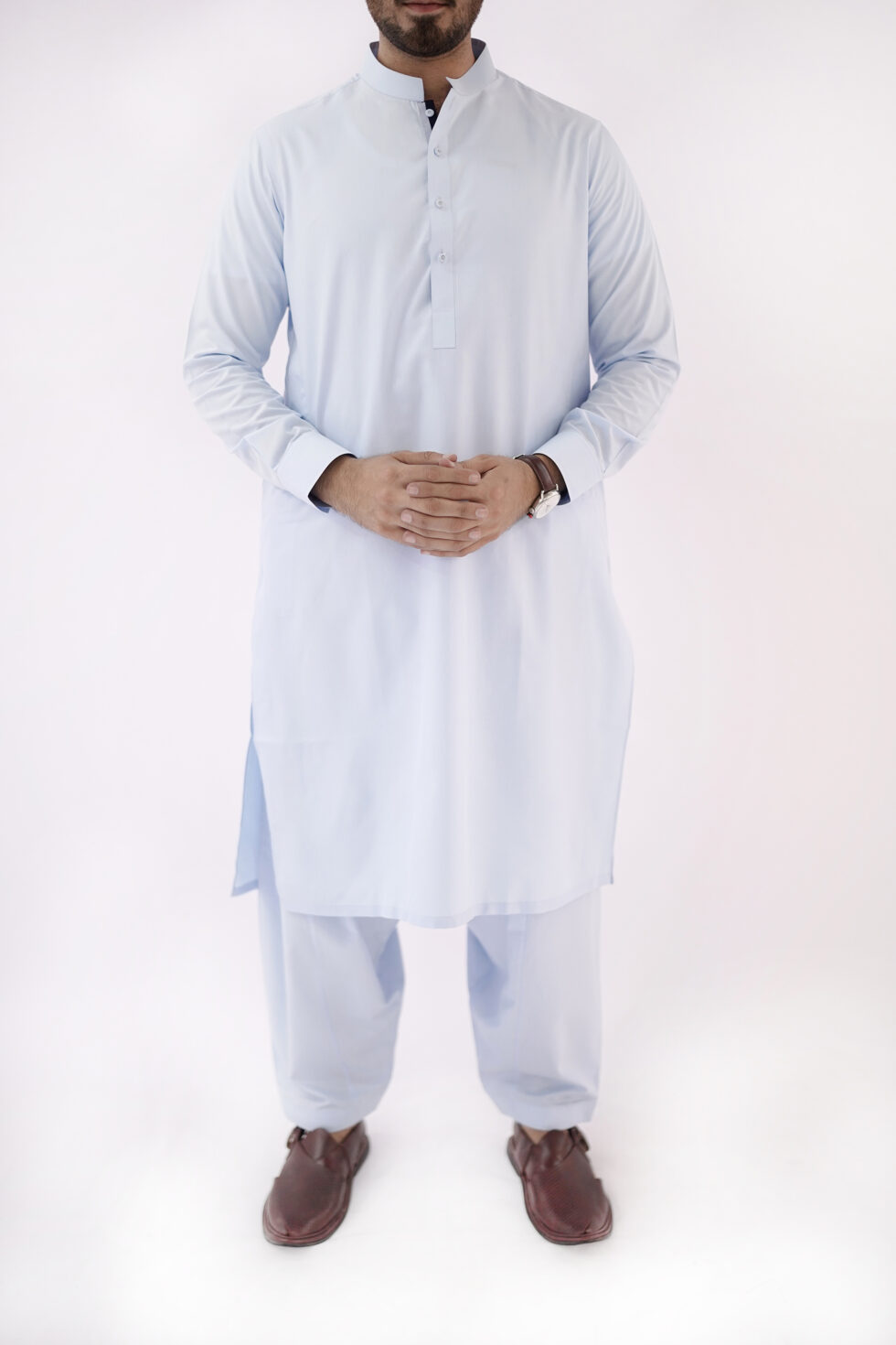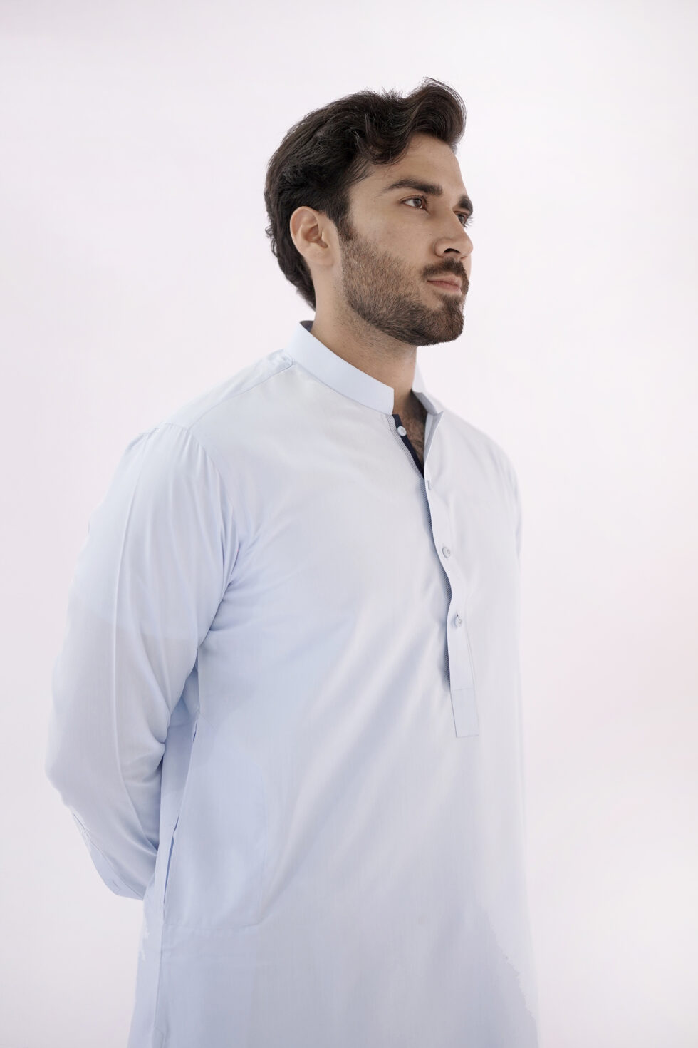 Introducing the men shalwar kurta in a sky light color, designed to embrace both comfort and style. This slim-fit ensemble is perfect for any occasion, whether it’s a festive celebration or a casual outing.