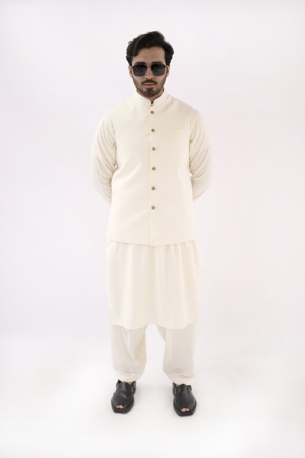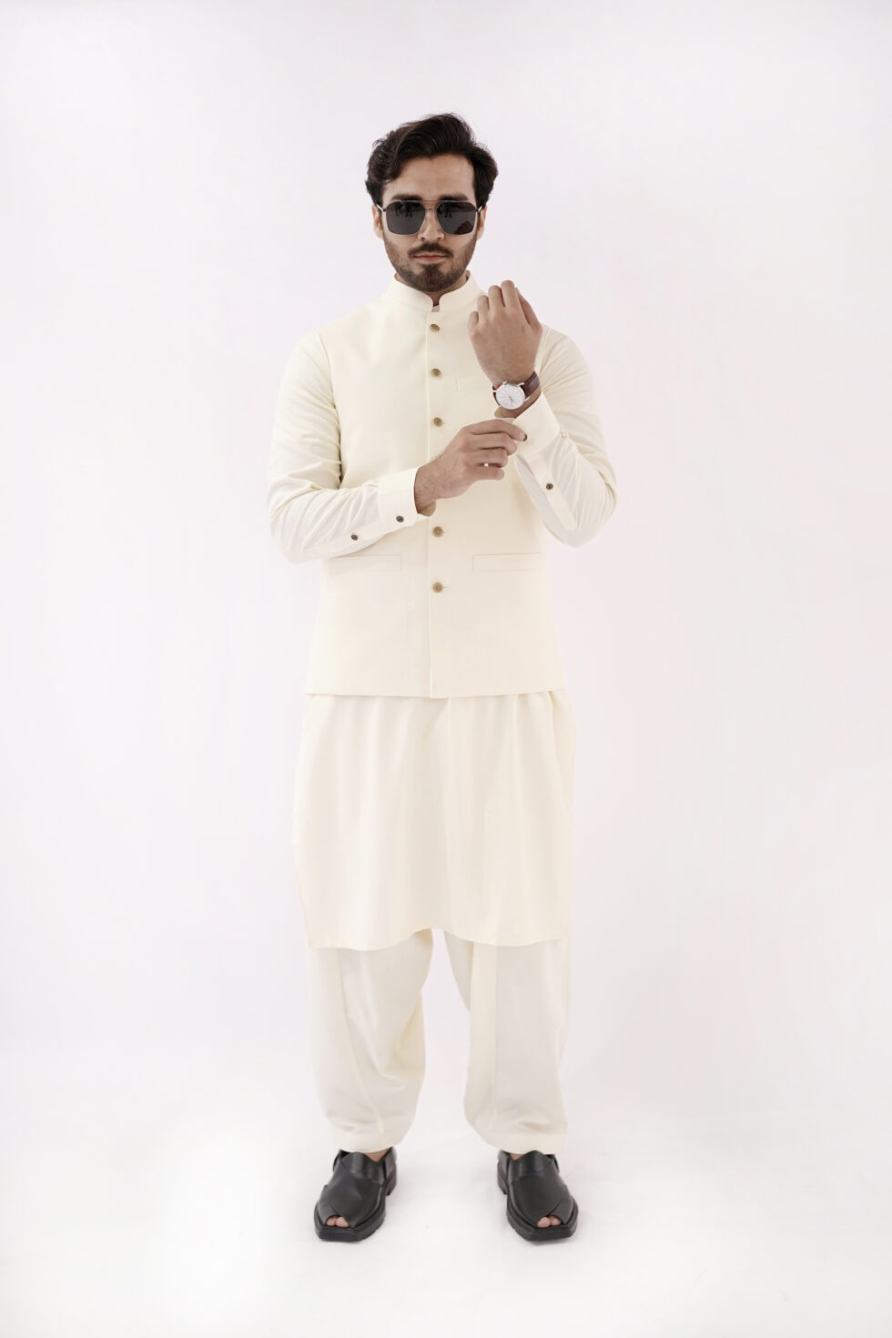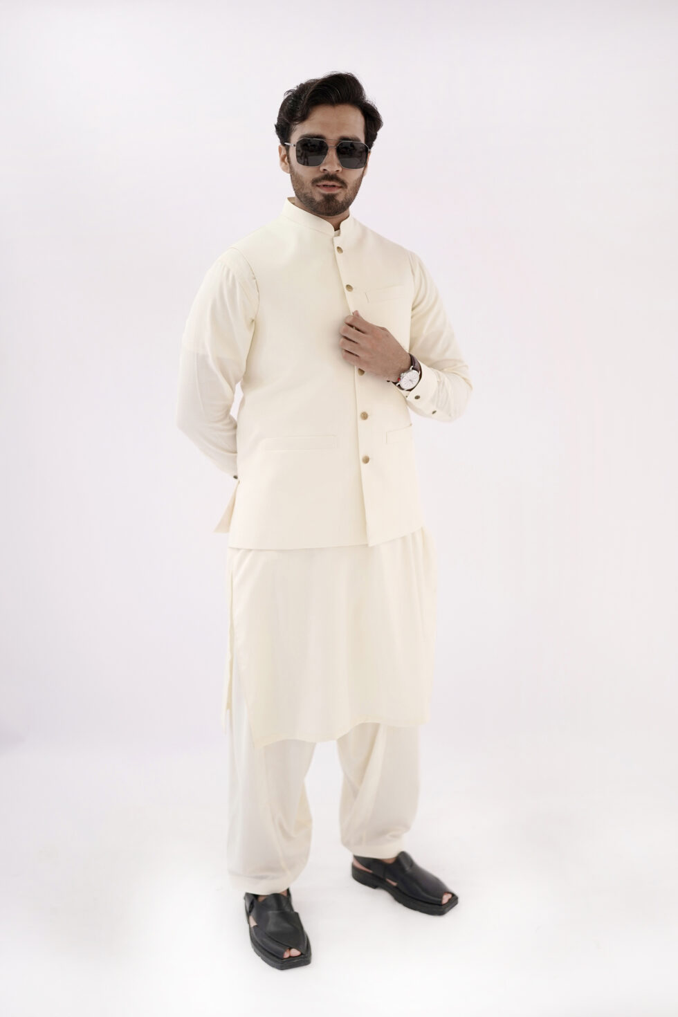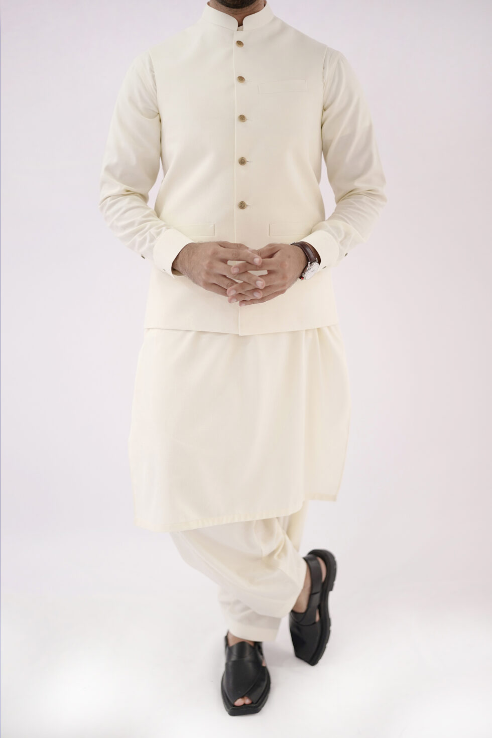 The cream color exudes sophistication and versatility, making it easy to pair with different accessories and shoes. Whether you want to dress it up with a statement waistcoat or keep it simple with a classic pair of mojari shoes, this kurta shalwar effortlessly adapts to your personal style.