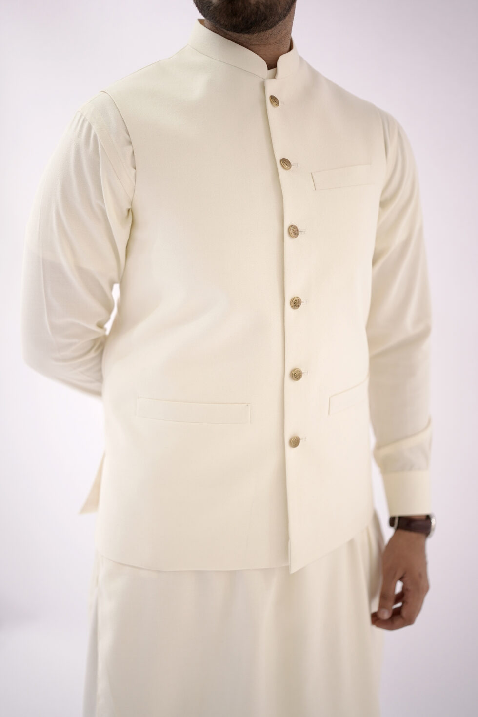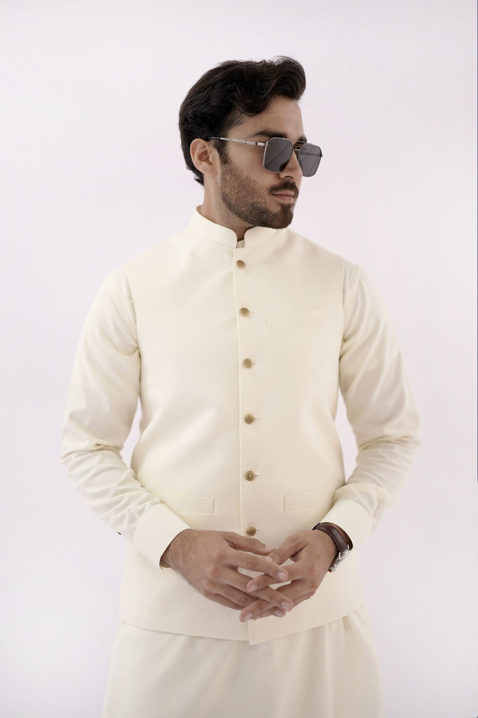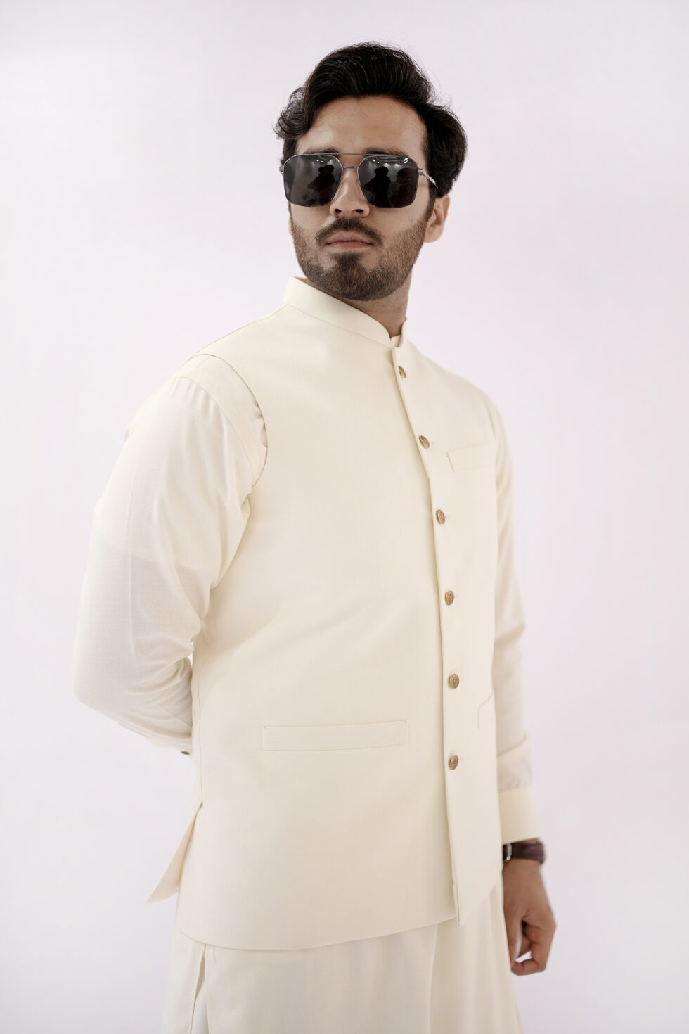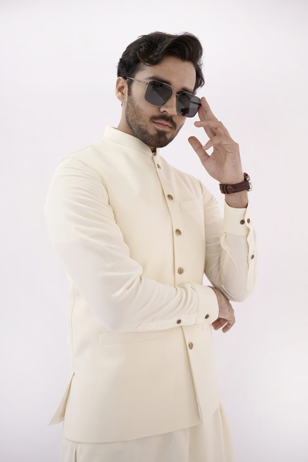 The cream color exudes sophistication and versatility, making it easy to pair with different accessories and shoes. Whether you want to dress it up with a statement waistcoat or keep it simple with a classic pair of mojari shoes, this kurta shalwar effortlessly adapts to your personal style.